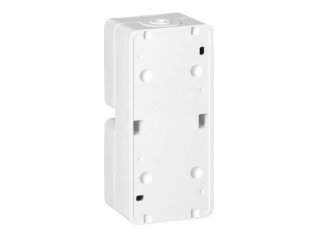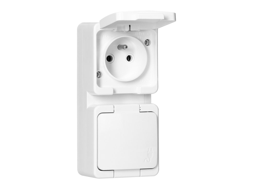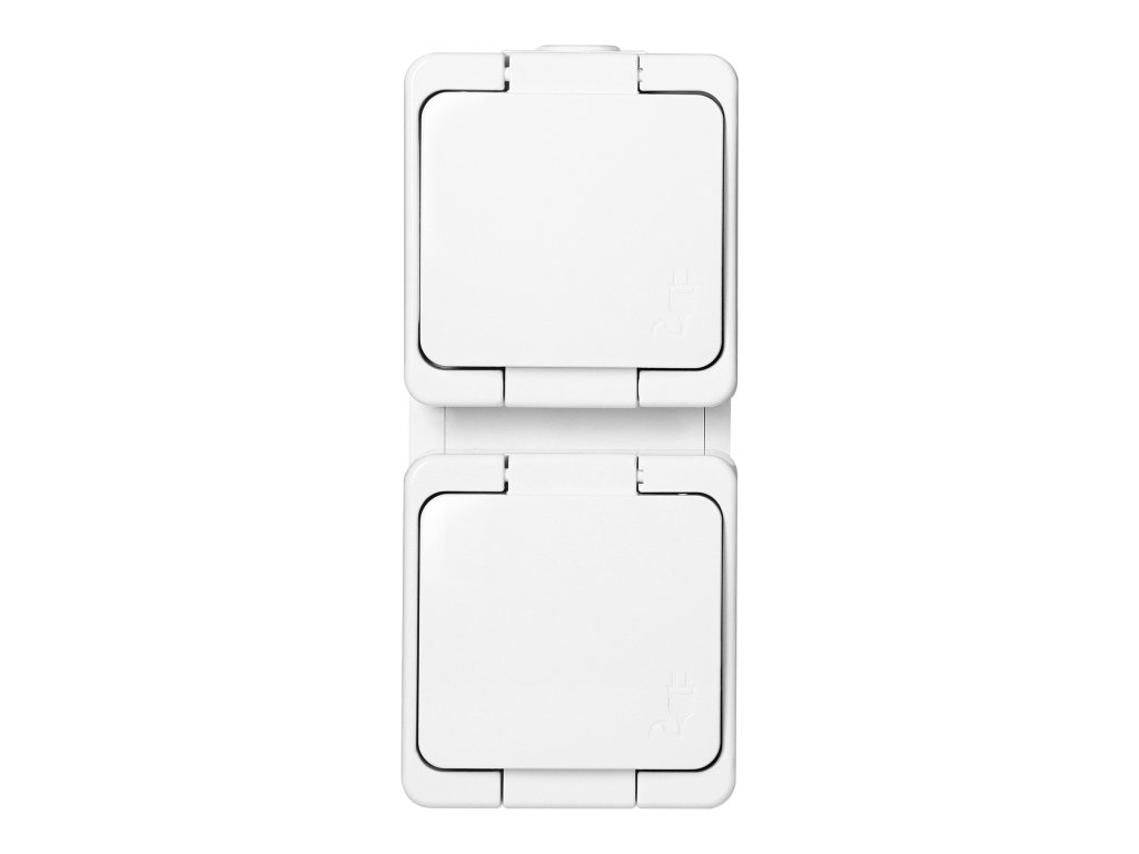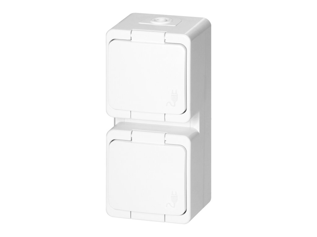 Felületre szerelhető dupla aljzat 2x2P+E, fröccsenő víz elleni védelem, fedéllel, függőleges, IP44, OKOS, fehér
