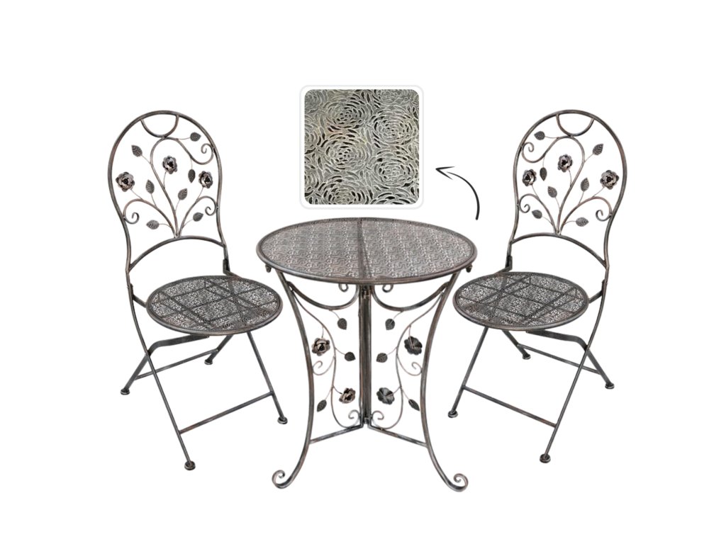 A bútort vintage stílus inspirálta, melynek elegáns mintái minden elrendezésnek egy kis bájt adnak. Ideálisan alkalmazható a kertben, teraszon vagy erkélyen, különleges karaktert kölcsönözve a térnek. Tartós fémből készült, biztosítva a tartósságot és stabilitást.
