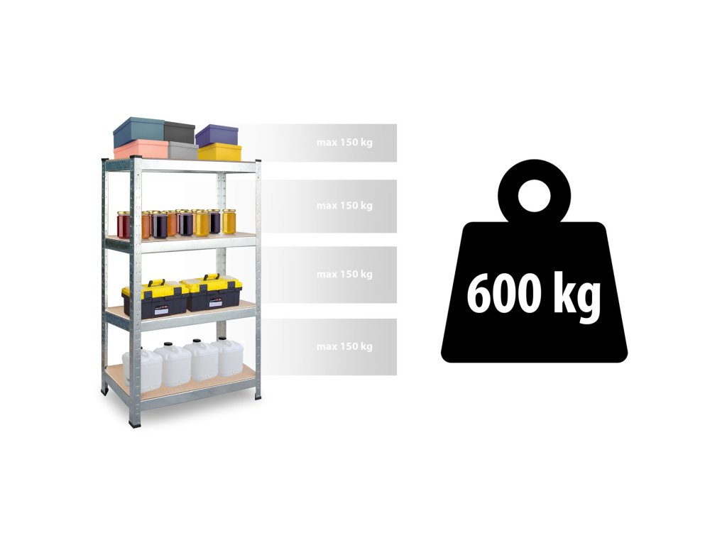 A polcot 4 polcból áll, amelyeken termékeket, kartonokat vagy eszközöket helyezhet el, miközben az egyes polcok legnagyobb terhelhetősége akár 150 kg.