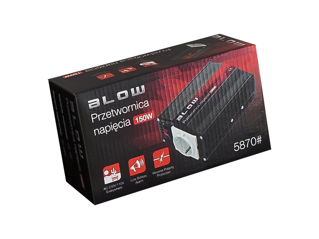 Elektronikus feszültségátalakító BLOW HRP-150. A készülék 12 V egyenfeszültséget alakít át 230 V váltakozó feszültséggé. Ezáltal ideális a 12 V-os telepítéssel felszerelt autókhoz és más járművekhez. Ideális laptopok, netbookok, töltők, háztartási kisgépek stb. tápellátásához.A készülék szilárd teljesítménnyel és alacsony meghibásodási aránnyal rendelkezik. Az inverter háza teljes egészében alumíniumból készült, ami megkönnyíti a hőelvezetést. Ezenkívül csendes ventilátorral van felszerelve, amely hűti a készülék belsejében lévő rendszereket. A HRP-150 számos védelemmel rendelkezik a csatlakoztatott berendezések védelme érdekében, többek között: túlterhelés elleni védelem, hővédelem, rövidzárlat elleni védelem stb. A BLOW átalakító automatikus újraindítási funkcióval rendelkezik. Ez szükségtelenné teszi az áram kikapcsolását, ha az inverter valamelyik védelem kikapcsolása után leáll. Egyszerűen csökkentse a terhelést, és az inverter automatikusan újraindul. A működési állapotot világító LED-ek jelzik. Az inverter szivargyújtó dugóval végződő tápkábellel rendelkezik, így a telepítés gyors és egyszerű.