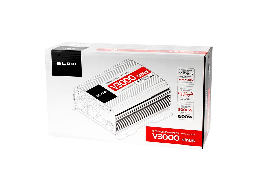 Elektronikus feszültségátalakító BLOW. A készülék a 24 V-os egyenfeszültséget 230 V-os váltakozó feszültséggé alakítja át. Ezáltal ideális a 24 V-os telepítéssel ellátott autókhoz és egyéb járművekhez. Ideális laptopok, töltők, háztartási kisgépek stb. táplálására.