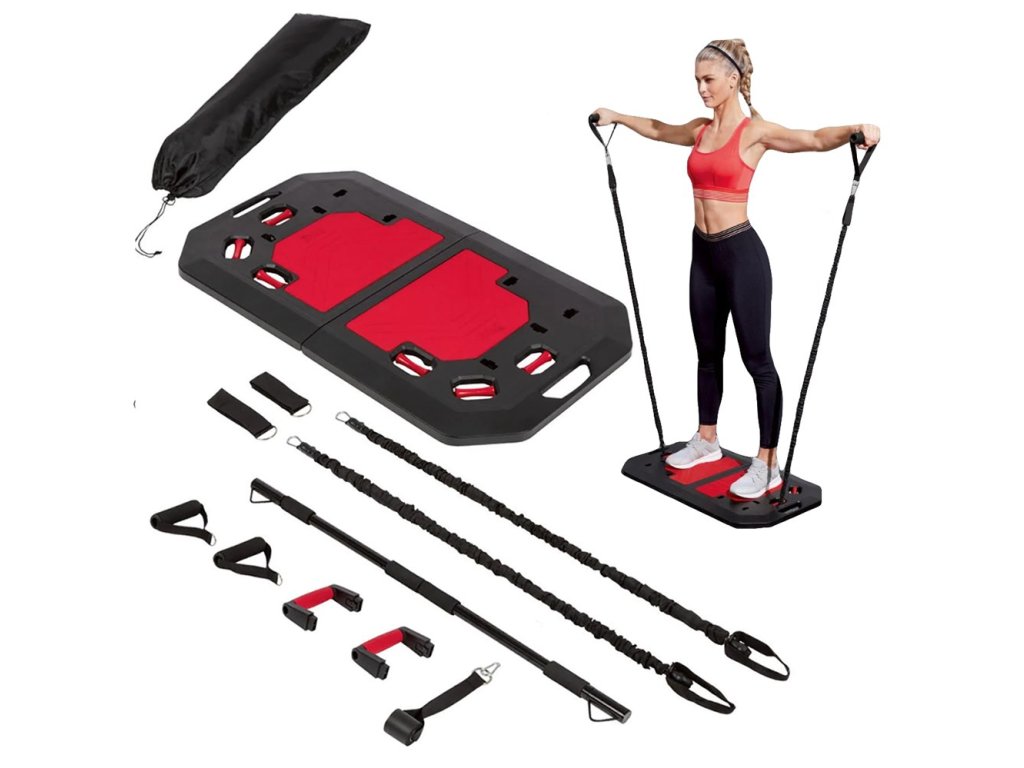 - Tartalmazza: 2 rugalmas tágító, 2 habszivacs fogantyú, 1 csavaros rúd, 2 állítható csuklóhurok, 1 kerethorgony, 2 behúzható fogantyú a fekvőtámaszok különböző pozíciókban történő elvégzéséhez, hordtáska, edzési kézikönyv