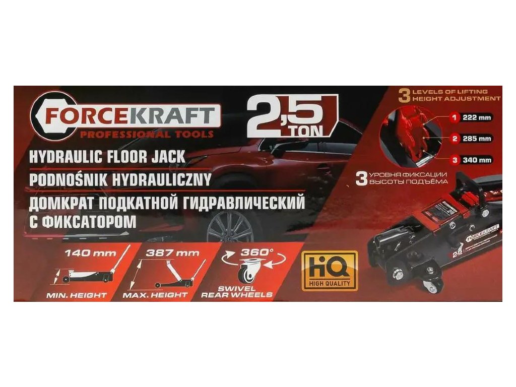 A FORCEKRAFT márkájú hidraulikus emelő egy robusztus és megbízható eszköz, amely járművek emelésére lett tervezve, maximum 2,5 tonna súlyig. Kompakt felépítésének, háromszintes blokkolási rendszerének és erős acél váznak köszönhetően ideális autós műhelyekben, gumiüzletekben, mobil szolgáltatásoknál és magán garázsokban.