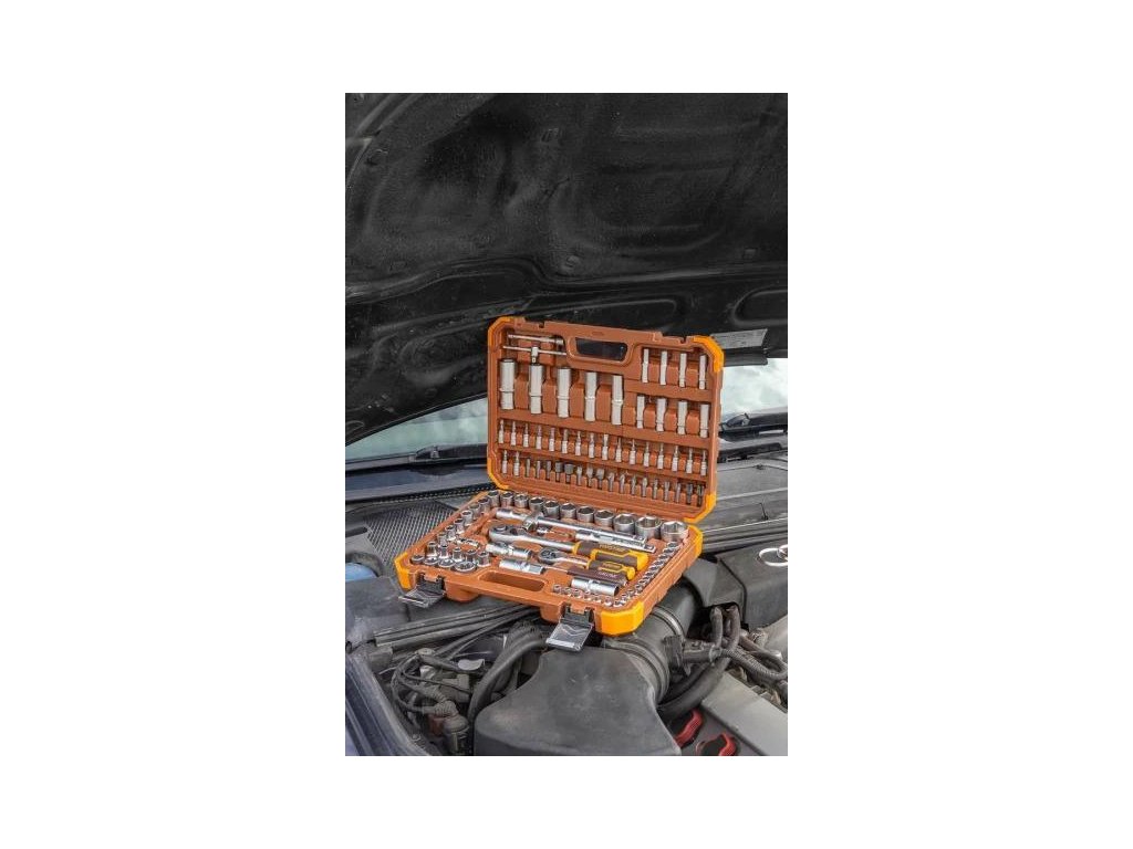 A dugók és a kulcsok kompatibilisek más gyártók szerszámkészleteivel. Kiváló 108 elemből álló eszközkészlet utazáshoz. Minden szerszám biztonságosan tárolva van egy műanyag táskában, fémből készült zárakkal a kényelmes és kompakt szállításhoz. A készlet ideális az autók szerelmeseinek, műhelyeknek és szervizközpontoknak.