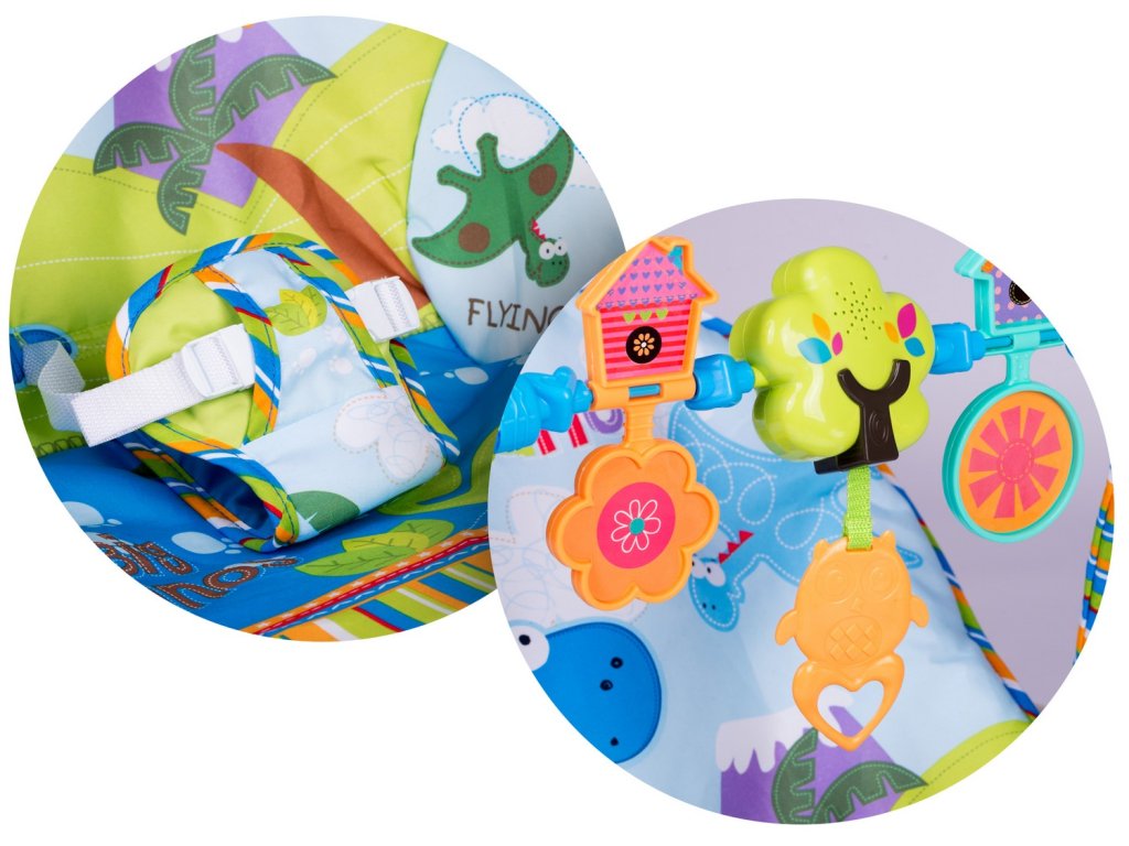 A babahintázó levehető fejpánttal rendelkezik, amelyhez zörgő játékokat csatoltak. Ezek szórakoztatják a babát, miközben Ön pihen.
