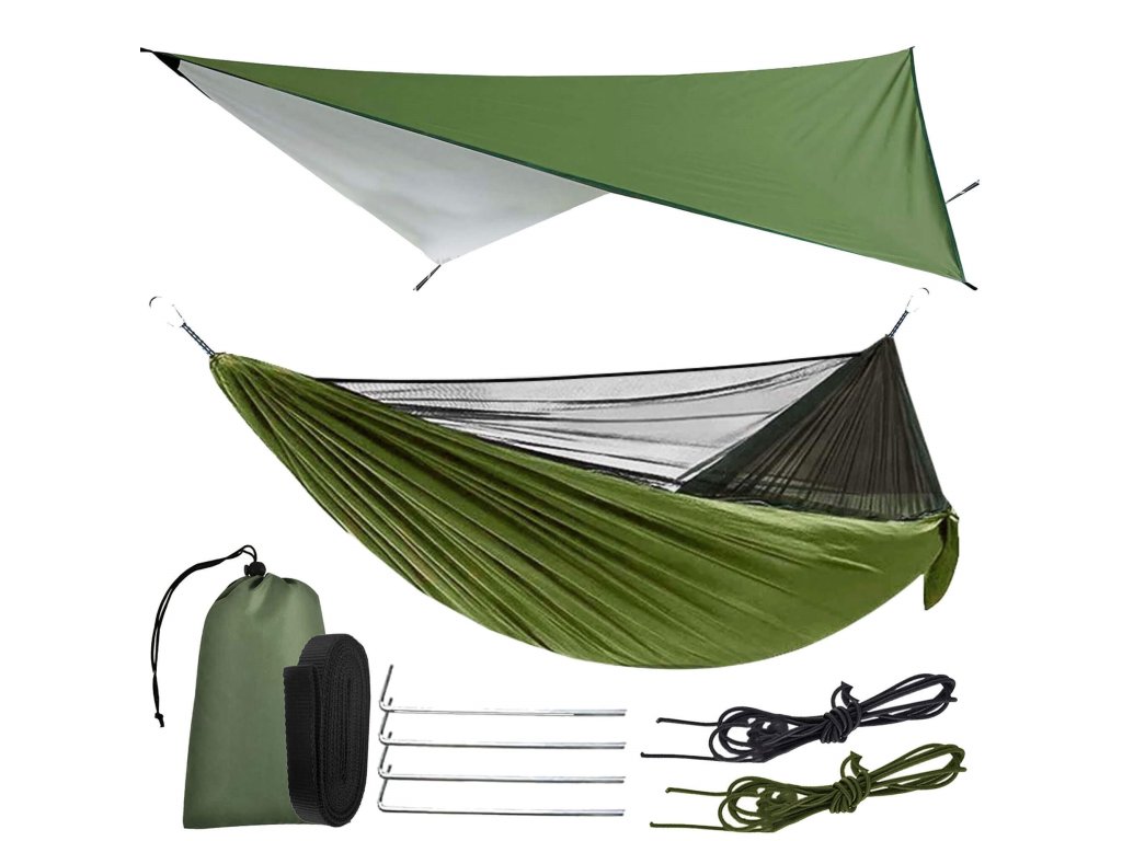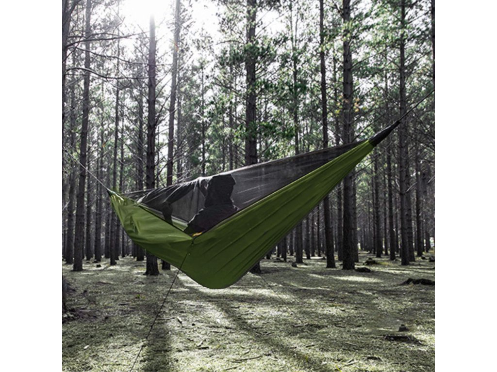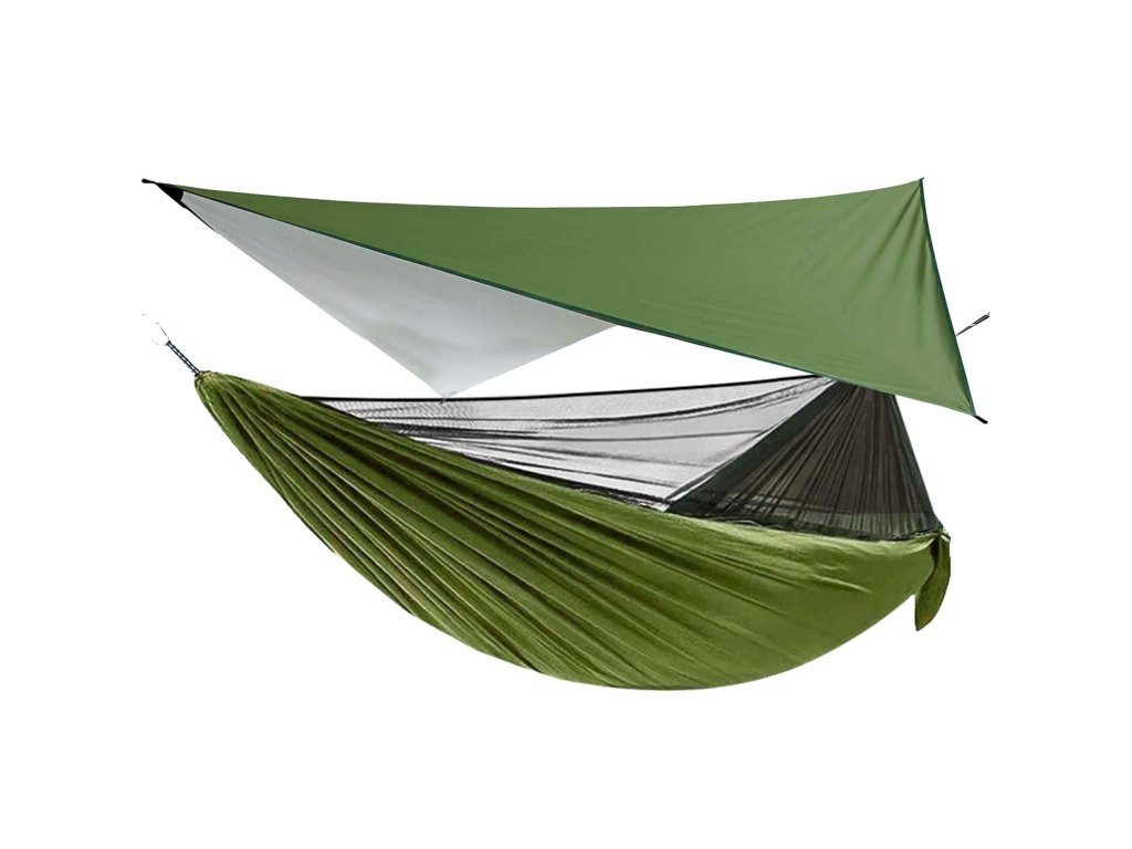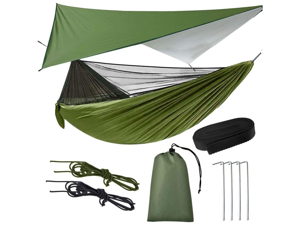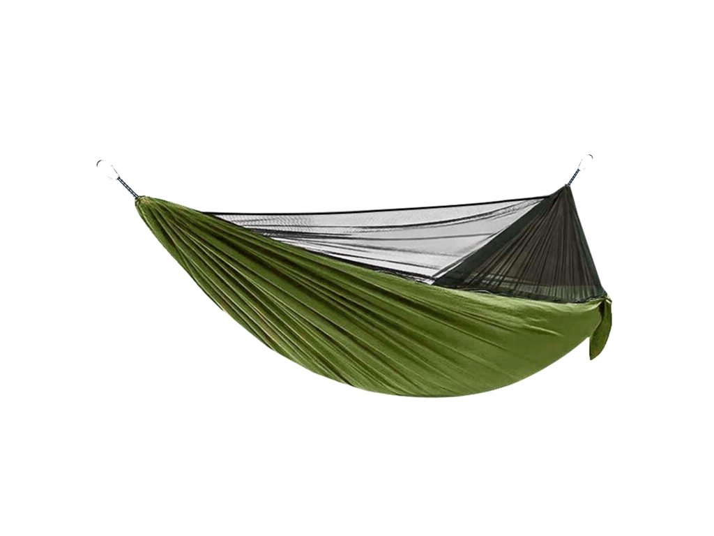 A készlet a következőket tartalmazza: függőágy szúnyoghálóval / 2 karabiner / rögzítőkötelek / 4 rögzítőcsap