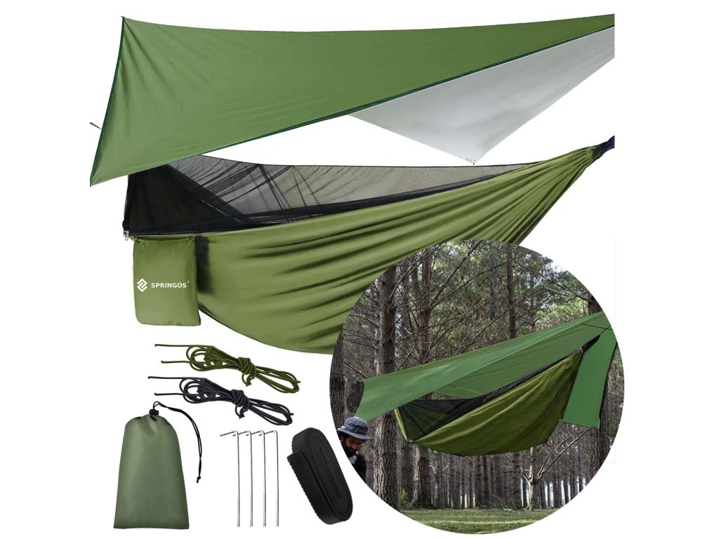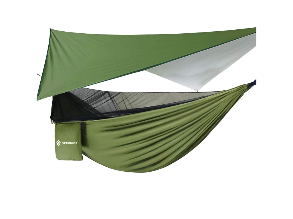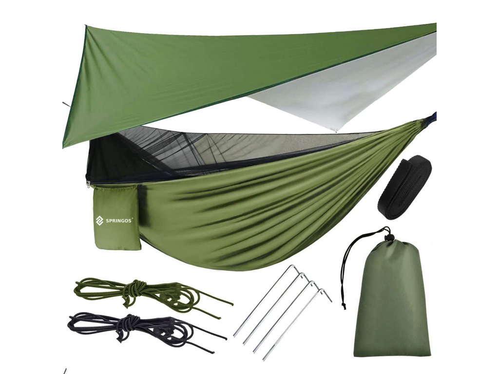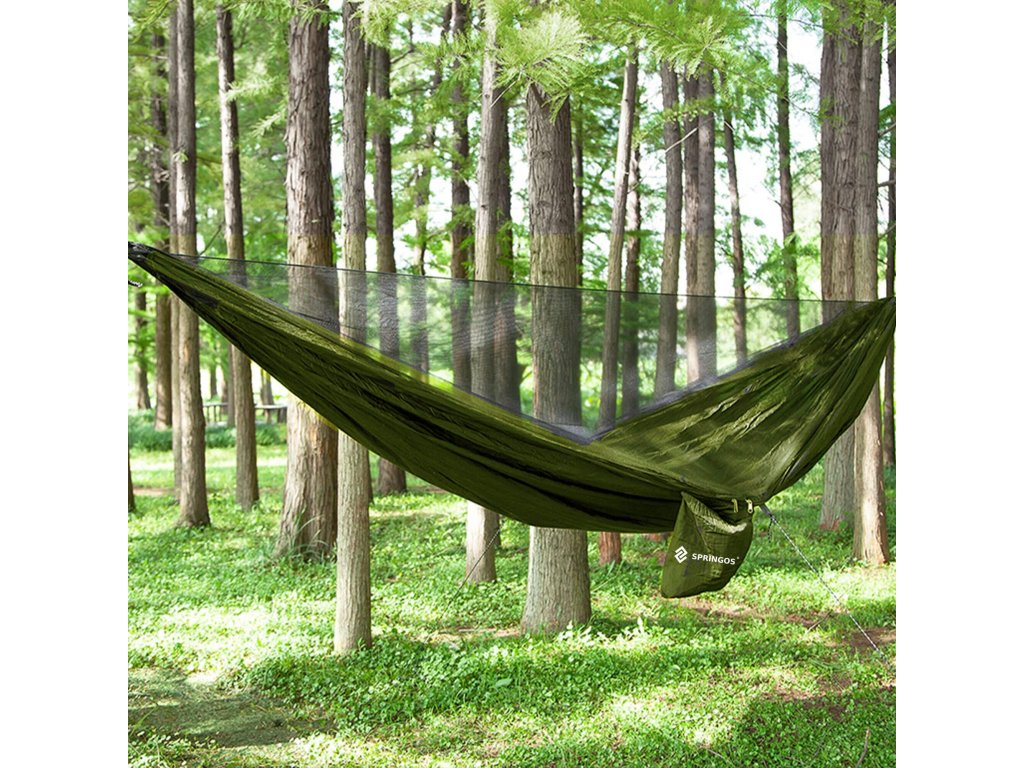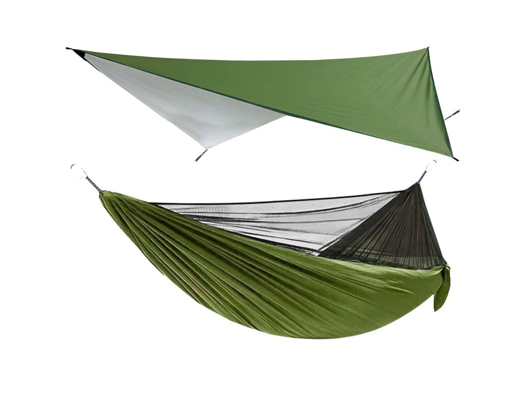 A készlet a következőket tartalmazza: függőágy szúnyoghálóval / 2 karabiner / rögzítőkötelek / 4 rögzítőcsap