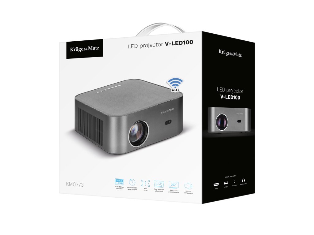 Természetesen a Wi-Fi használata nem az egyetlen lehetőség a képek továbbítására. A Kruger&Matz V-LED100 projektor sokkal több lehetőséget kínál a lejátszási forrás kiválasztásában. Számos port áll rendelkezésre: HDMI, 2 x USB, vonali kimenet és AV bemenet, amelyek segítségével csatlakoztathatja digitális vevőjét, pendrive-ját vagy laptopját.