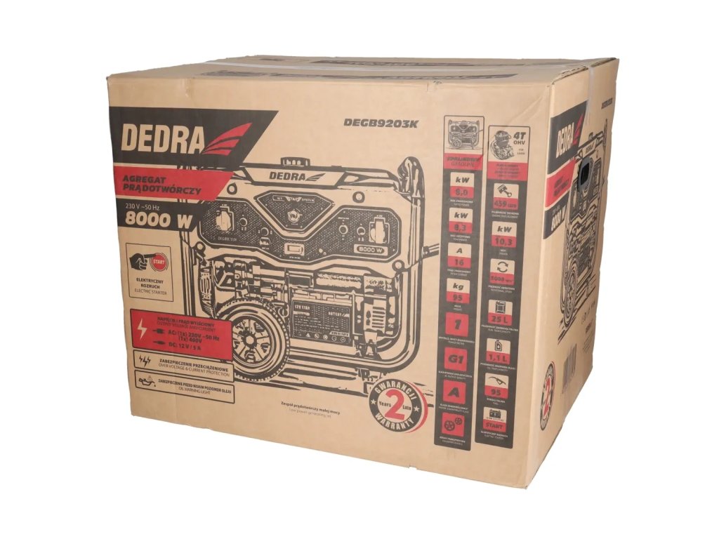 Maximális teljesítmény: 8,3 kW / folyamatos működés: 8,0 kW, térfogat: 459 cm3, aljzatok: 230V/400V/12V, tartály 25 l, ## kézi ## és elektromos indításKiegészítő paraméterek