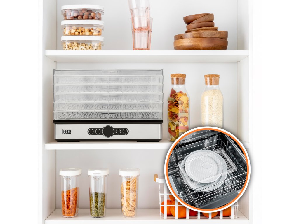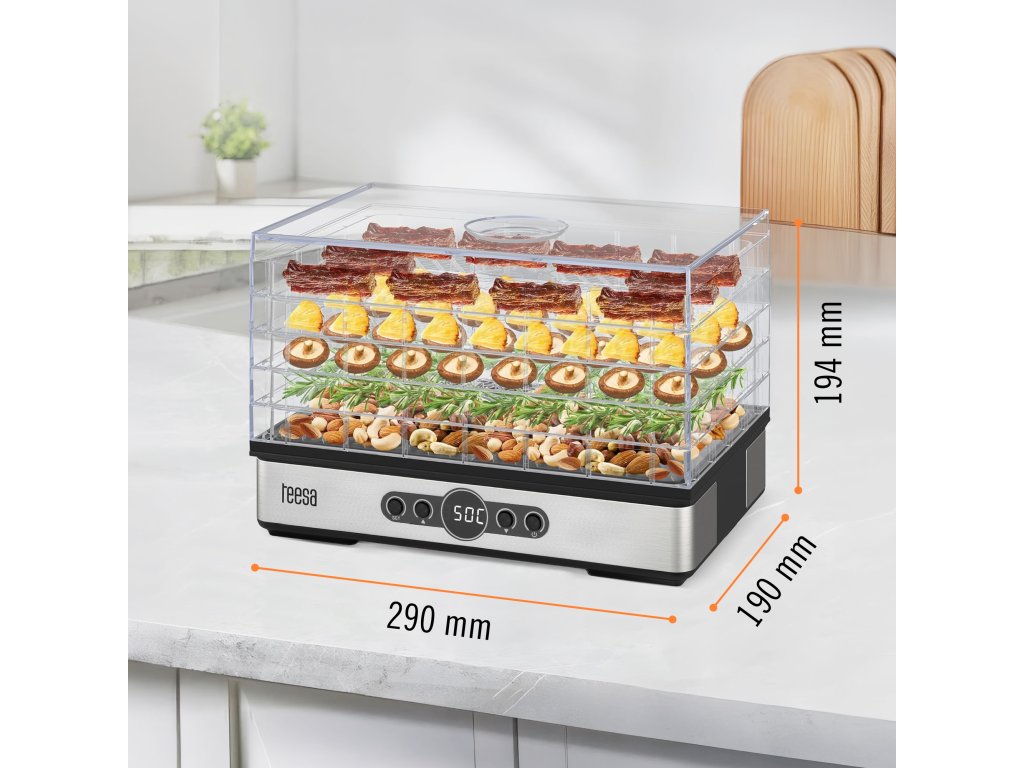 A Teesa szárító akár 5 nagy, átlátszó tálcát kínál, amelyek összesen akár 1,7 kg terméket is befogadnak. Az átlátszó tálcák lehetővé teszik a szárítás ellenőrzését az eszköz kinyitása nélkül, ami állandó hőmérsékletet és hatékonyságot biztosít.
