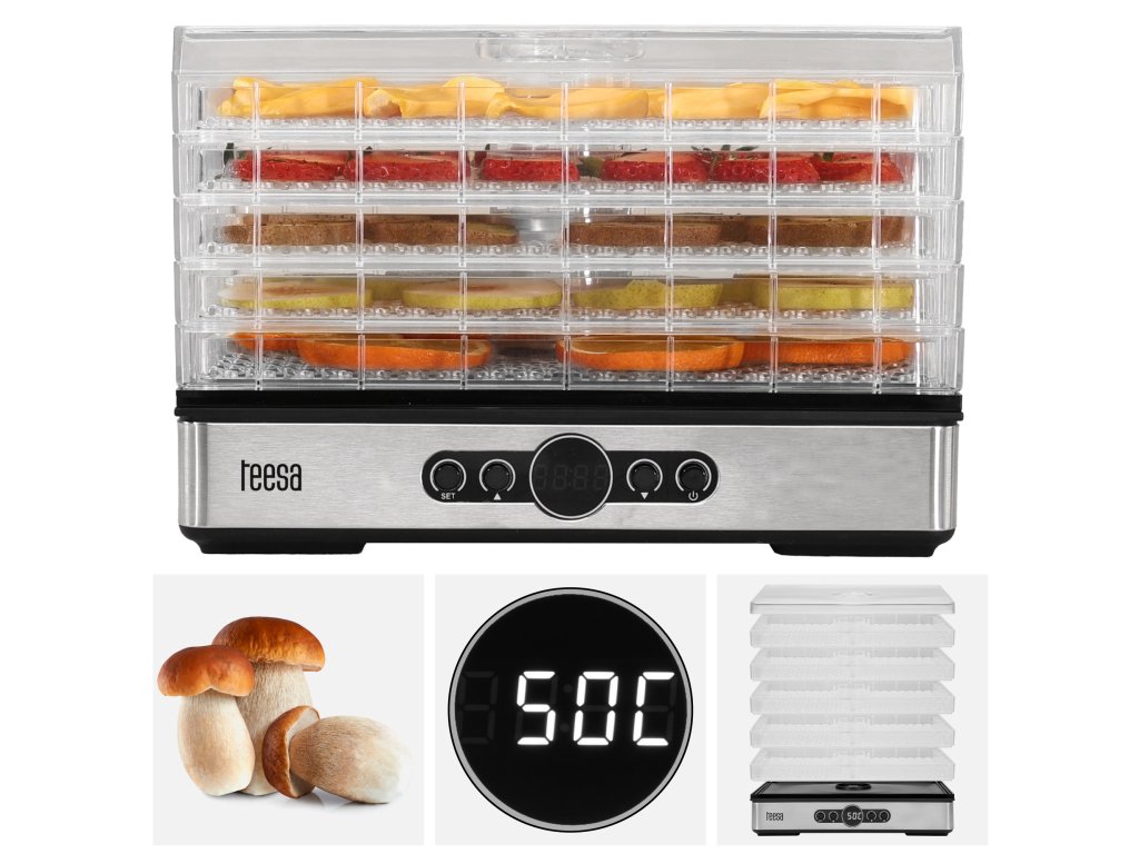Gomba-, zöldség- és gyümölcsszárító, 400W, 5 tálca, kijelző, forrólevegős keringetés, TEESA