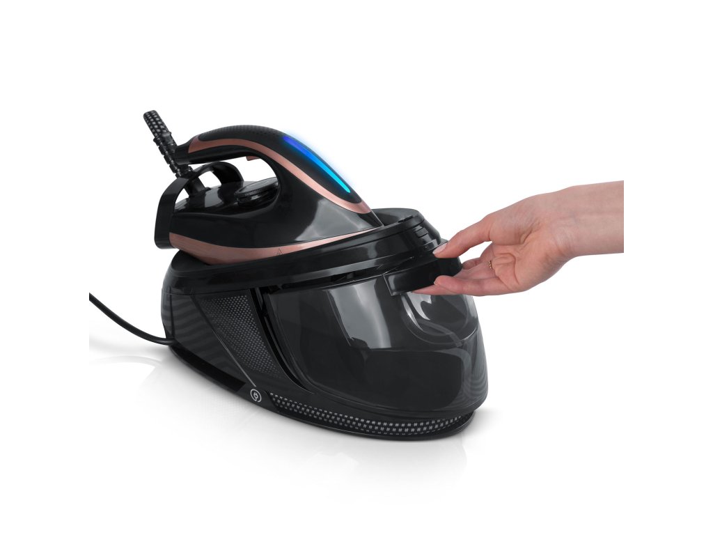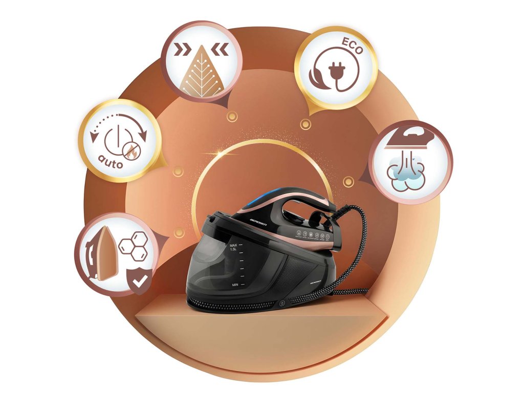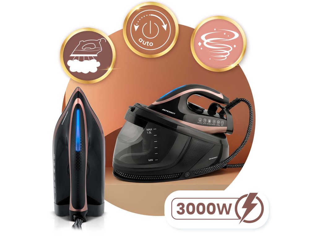 AKÁR 3000 W TELJESÍTMÉNY | ÖNTISZTÍTÁS | TÚLMELEGEDÉSVÉDELEM | 1500 ML-ES VÍZTARTÁLY | VERTIKÁLIS GŐZ | HŐMÉRSÉKLET-SZABÁLYOZÁS | AUTO-OFF | KÁBEL CSÉVÉLŐ | TÖLTŐ ALÁTÉT | HOSSZÚ KÁBEL