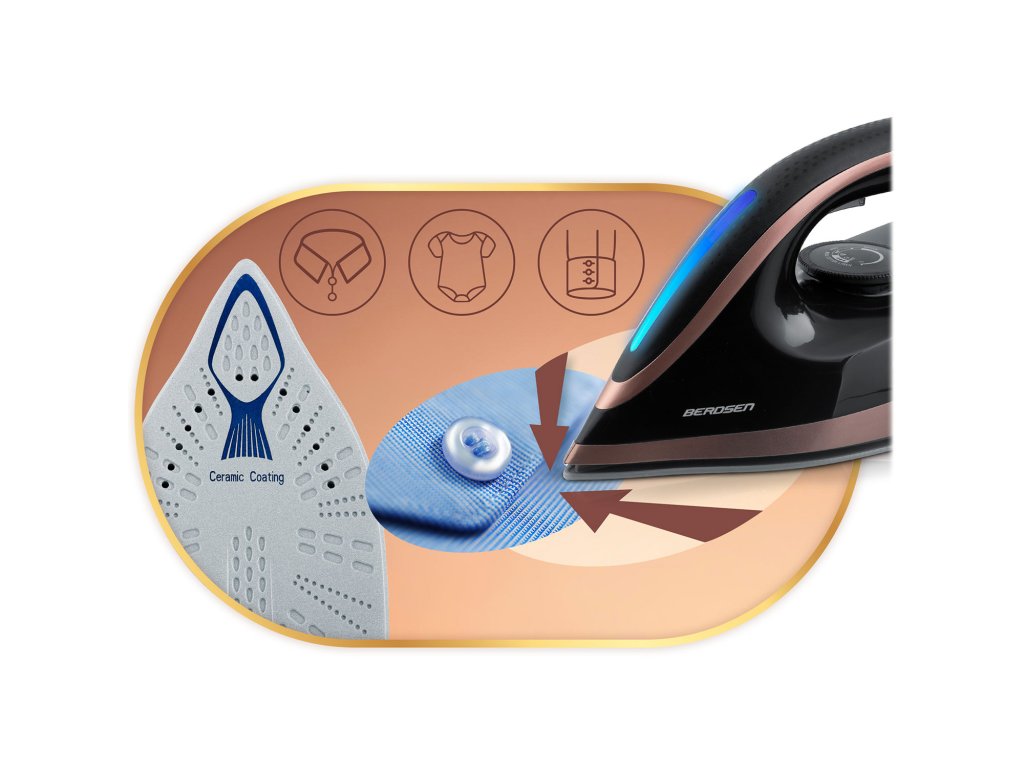 Eléri ott is, ahol más vasalók feladjákKivételesen precíz, profilozott kerámia talp valódi játékváltó. Karcsú formája lehetővé teszi, hogy könnyedén elérjen nehezen hozzáférhető helyeket – gombok között, gallérok körül, mandzsettáknál vagy gyerekruhákon.