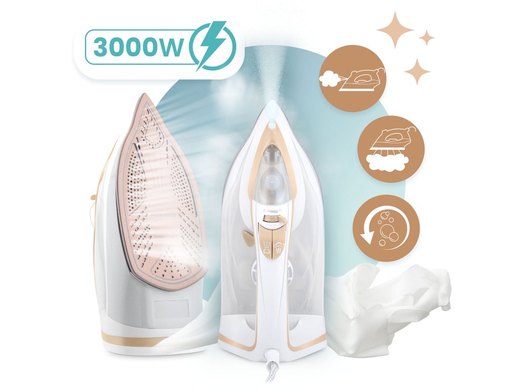 AKÁR 3000 W TELJESÍTMÉNY | ÖNMEGTAKARÍTÁS | TÚLHEVÍTÉS ELLENI VÉDELEM | VÍZTARTÁLY 350 ML | VERTIKÁLIS GŐZ | HŐMÉRSÉKLET-SZABÁLYOZÁS | AUTO-OFF | PERMETEZŐ
