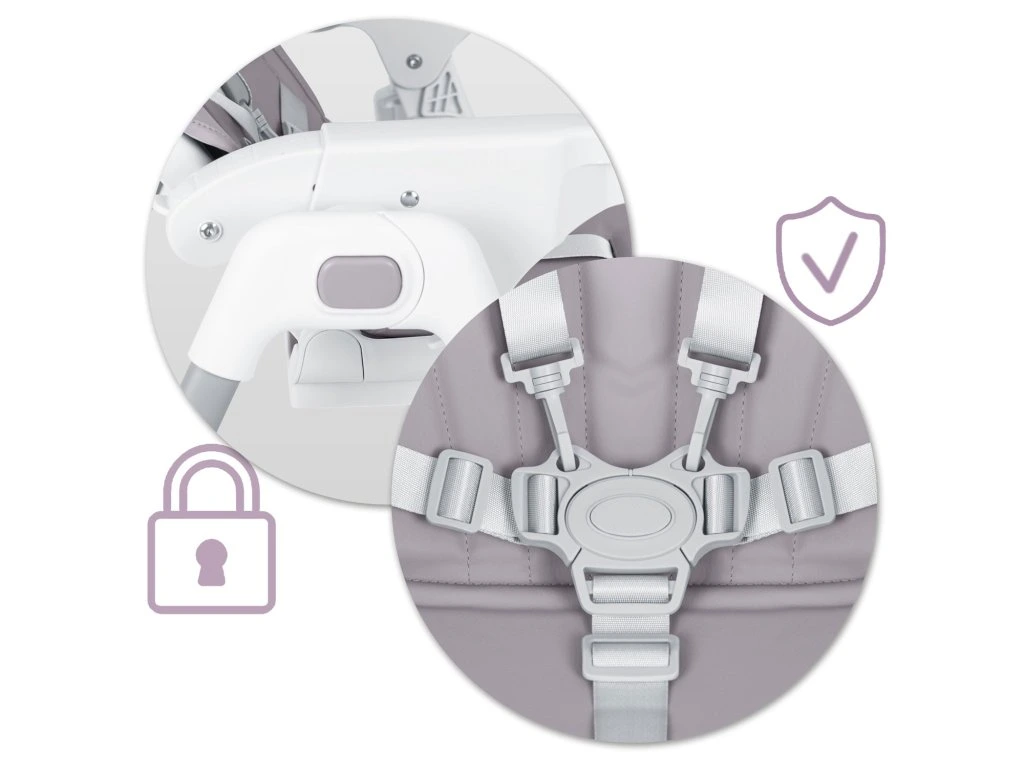 Amegbízható és bevált ötpontos biztonsági övek azt jelentik, hogy a baba nem fogja tudni egyedül elhagyni a széket, és nem kockáztatja a leesést.
