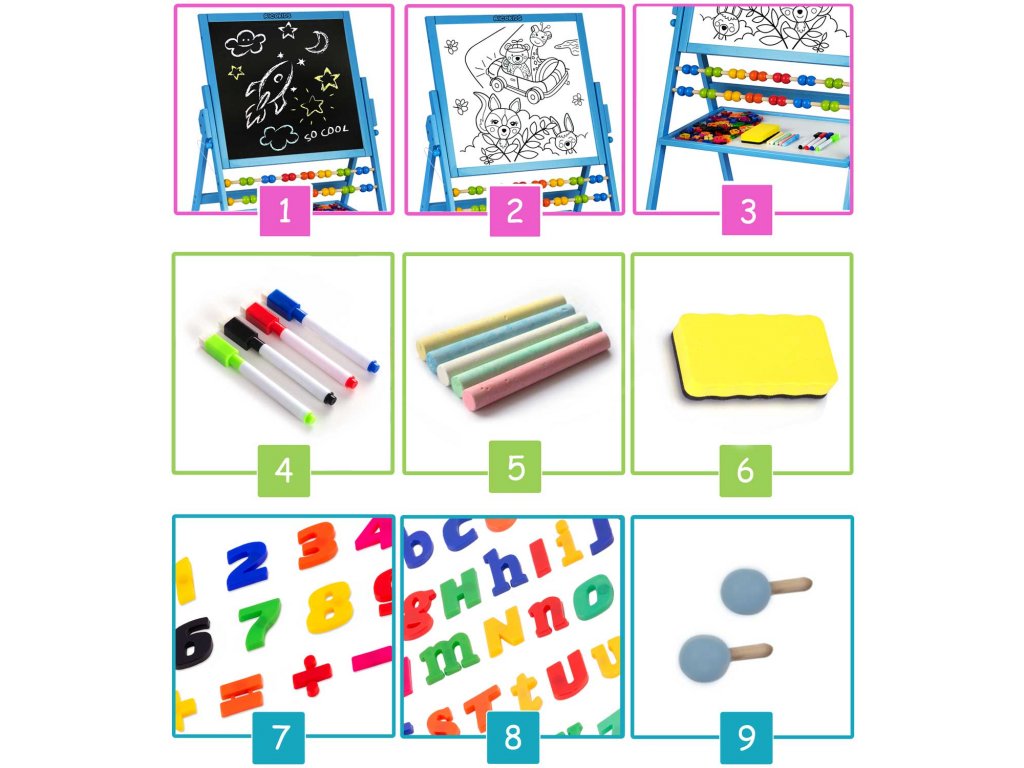 - Számolótábla - ideális a számolás játékos megtanulásához és az első egyszerű matematikai számítások elvégzéséhez, ami felgyorsítja gyermeke fejlődését.