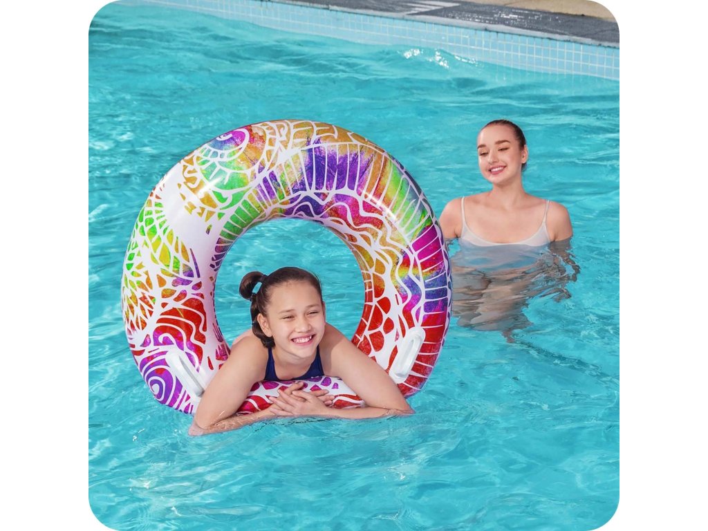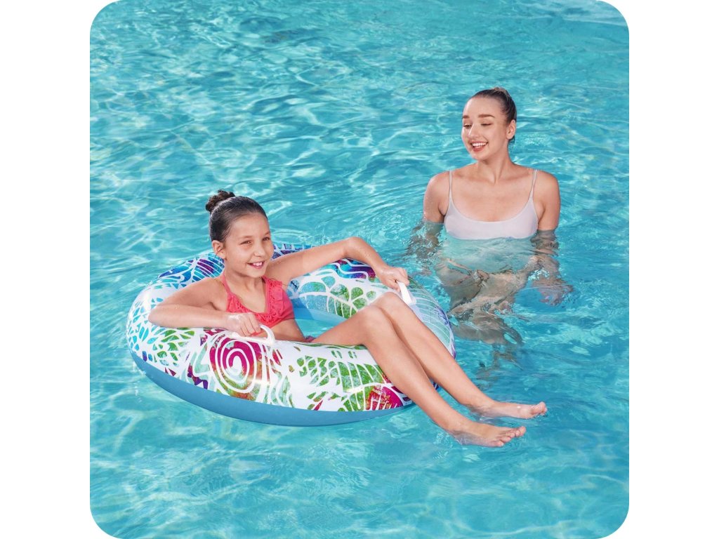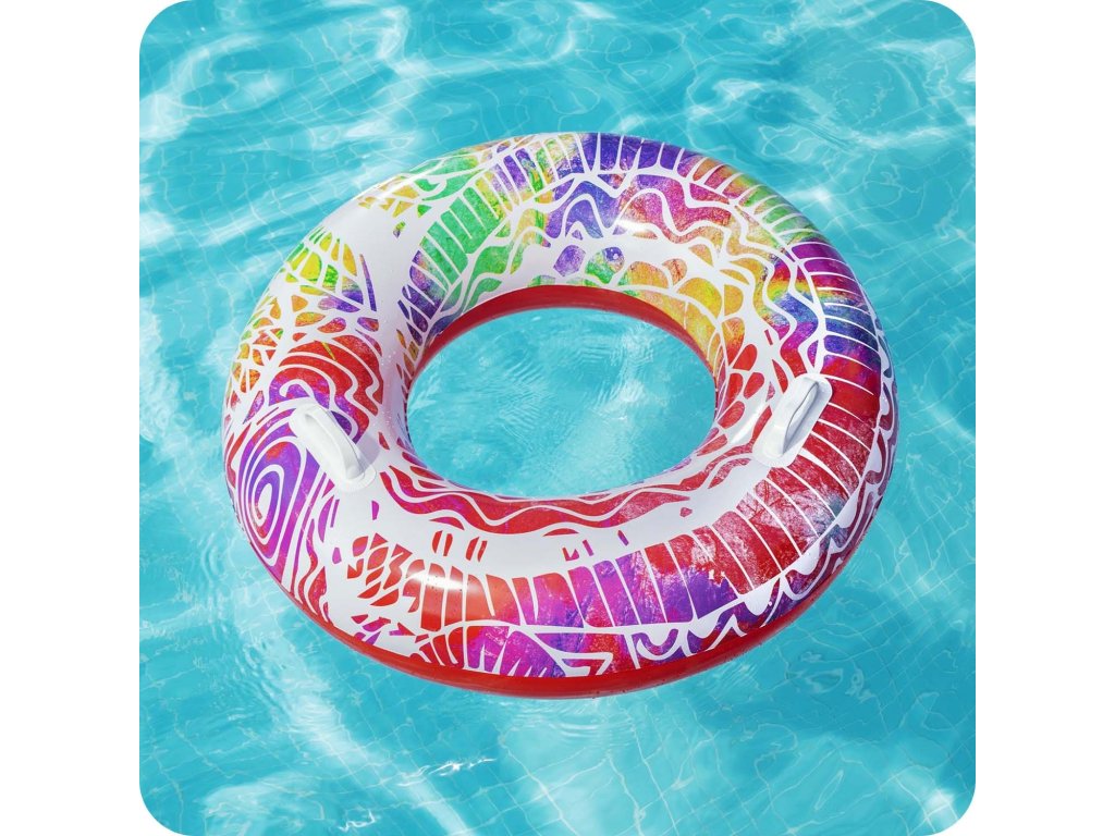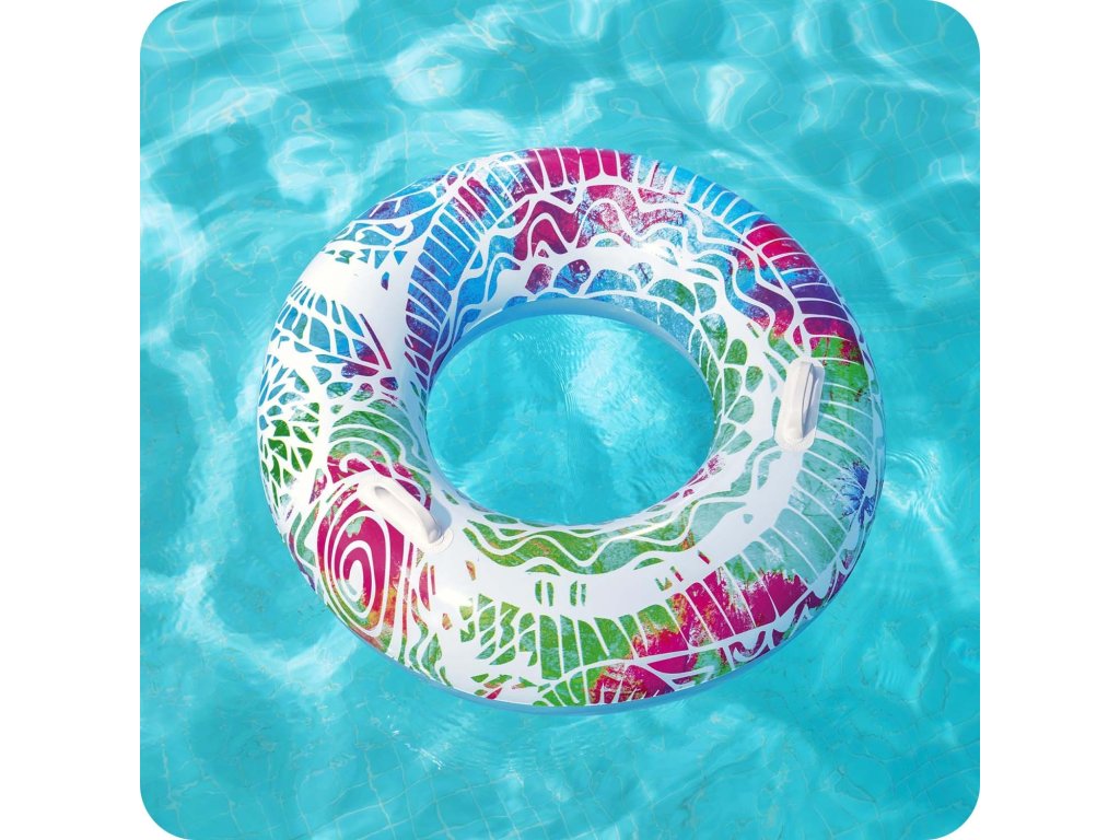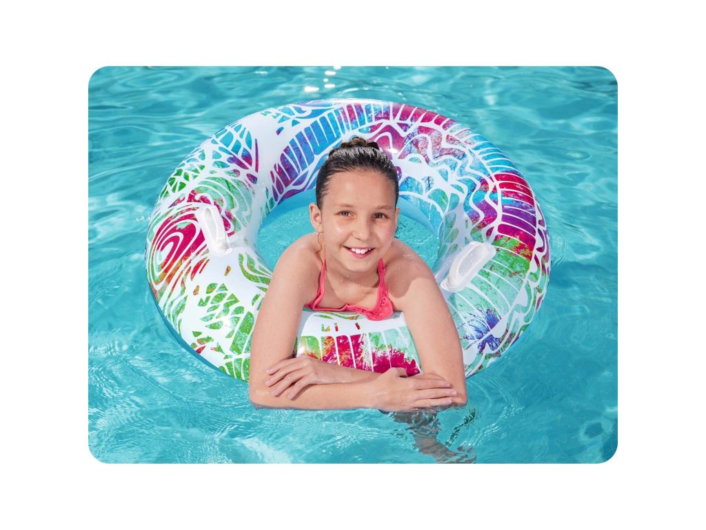 Úszógumi 91 cm BESTWAY 36084 NYÁRI SLÁGER A legklasszikusabb felfújható strandkiegészítő új köntösben! A gumi nagyon praktikus, kényelmes, és nagyszerűen mutat a strandon. Tartós PVC-ből készült, amely ellenáll a napfénynek és a sós víznek. Erős fogantyúk! Két masszív fogantyú biztosít nagyobb stabilitást, stresszmentessé téve a pihenést, és különösen praktikusak a gumi szállításakor. Főbb jellemzők: egyedi minta nagy átmérő két masszív fogantyú Műszaki adatok: Méretek: átm. 91 cm Anyag: PVC Súly: 0,35 kg Ajánlott életkor: 10 éves kortólKiegészítő paraméterek