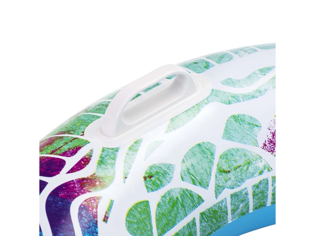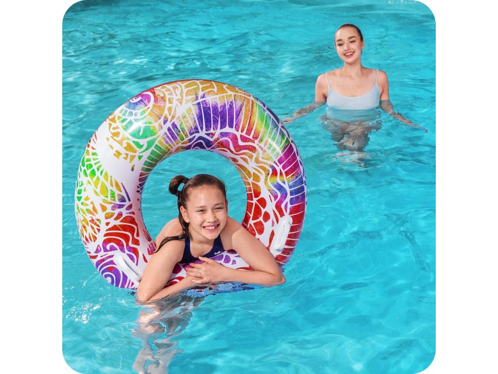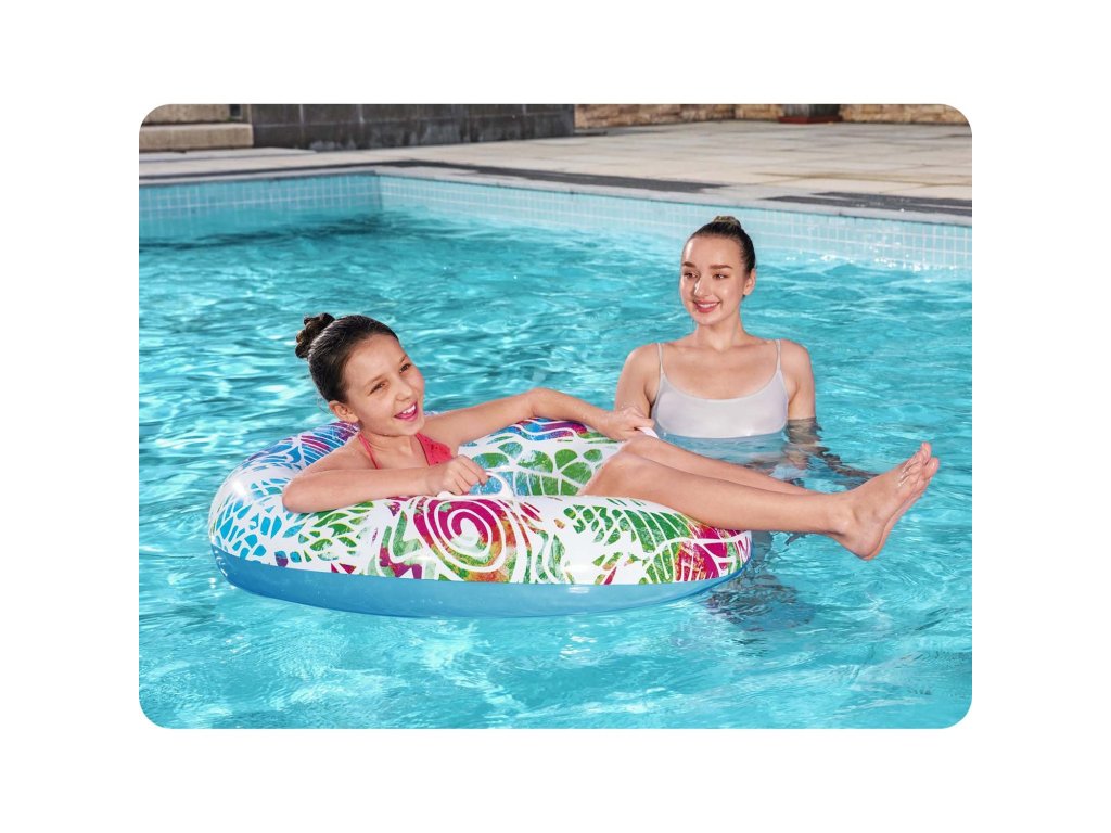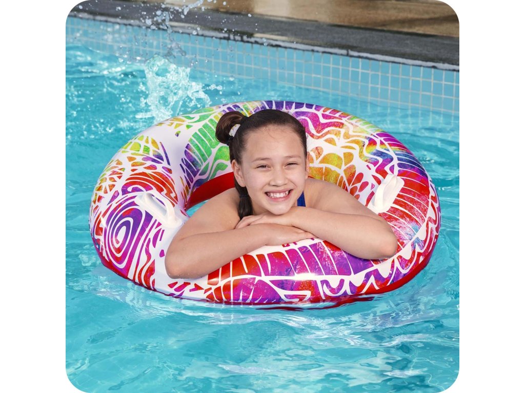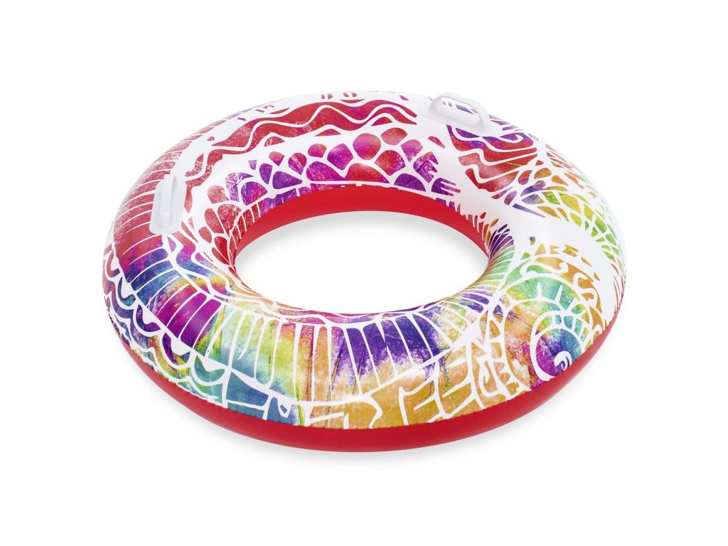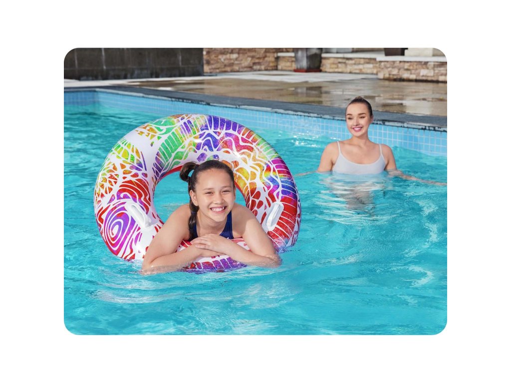 Úszógumi 91 cm BESTWAY 36084 NYÁRI SLÁGER A legklasszikusabb felfújható strandkiegészítő új köntösben! A gumi nagyon praktikus, kényelmes, és nagyszerűen mutat a strandon. Tartós PVC-ből készült, amely ellenáll a napfénynek és a sós víznek. Erős fogantyúk! Két masszív fogantyú biztosít nagyobb stabilitást, stresszmentessé téve a pihenést, és különösen praktikusak a gumi szállításakor. Főbb jellemzők: egyedi minta nagy átmérő két masszív fogantyú Műszaki adatok: Méretek: átm. 91 cm Anyag: PVC Súly: 0,35 kg Ajánlott életkor: 10 éves kortólKiegészítő paraméterek