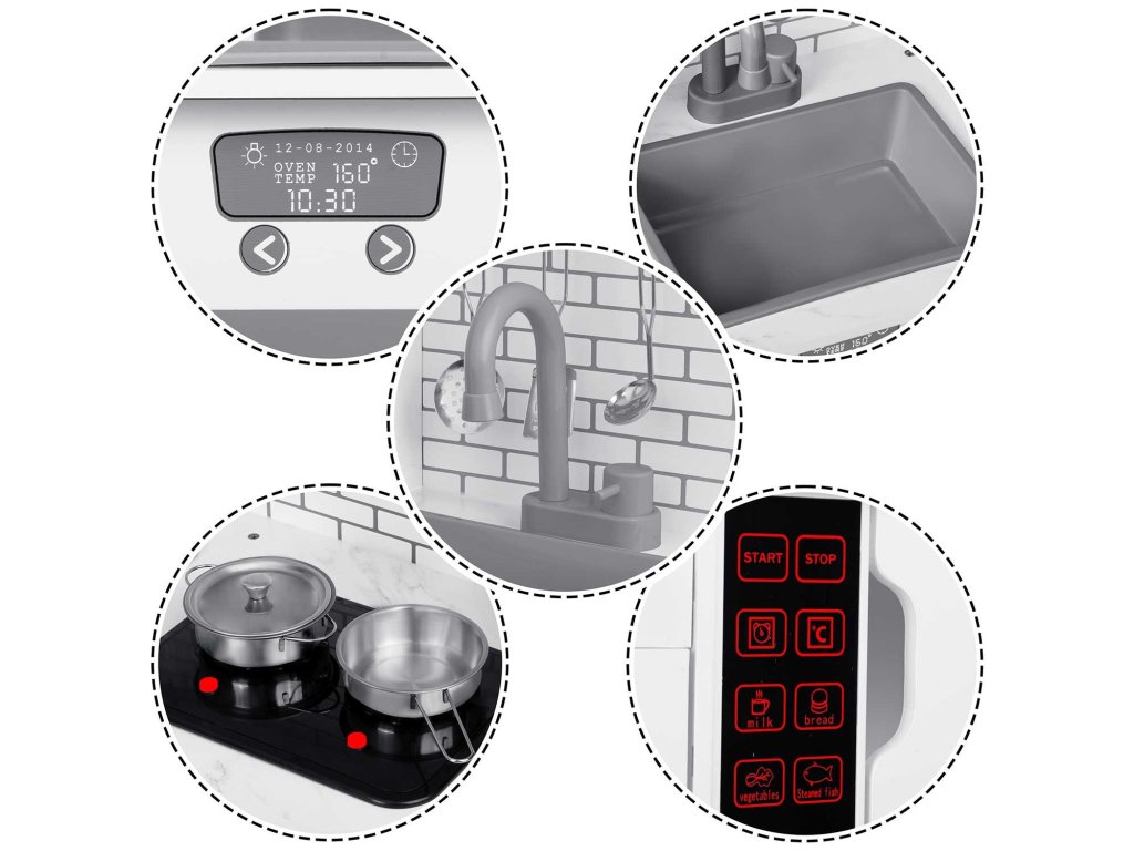 Az égők nem csak akkor gyulladnak be, ha megnyomsz egy gombot. Olyan hangokat is adnak ki, amilyeneket a gyermek valódi főzés közben hall, például a víz csobogását.
