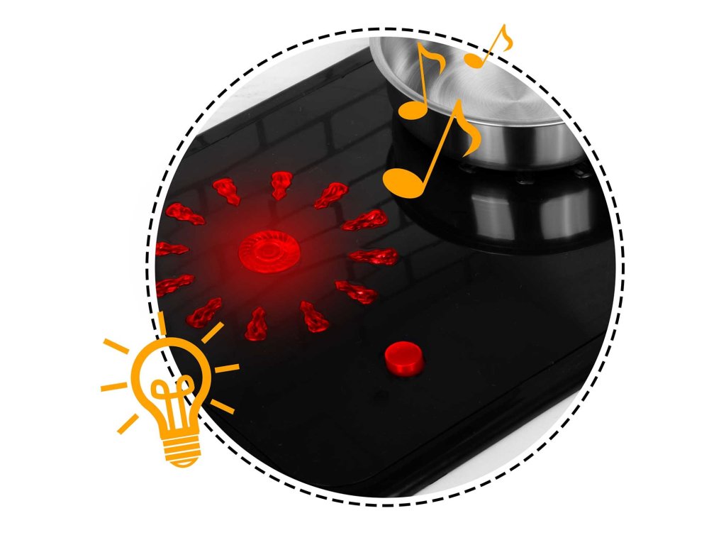 - Főzőlap égőkkel és gombokkal, amelyek bekapcsolják az égő hangját és fényeit.