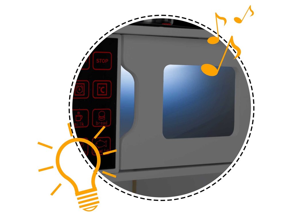 Azinteraktív mikrohullámú sütő kinyitásakor világít és hangokat ad ki, így gyermeked gyorsan felmelegítheti kedvenc ételét, és remekül szórakozhat!