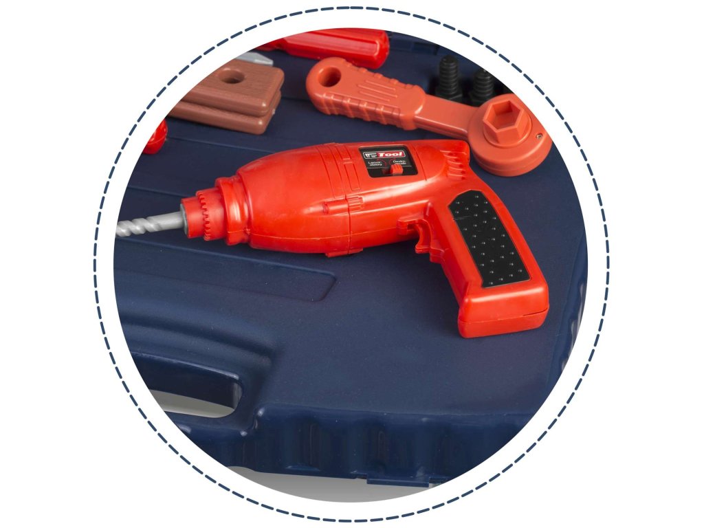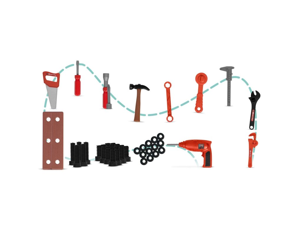 - számos tartozék (4 x csavarkulcs, kalapács, fűrész, csavarok, csavarhúzók, barkácsszalagok, mérőkalapács),