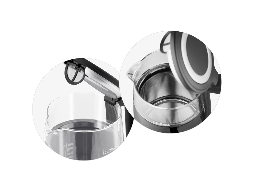 - *A vízforraló teteje edzett üvegből készült, és nem biztosít hőszigetelést. Gombbal nyitható fedél és fémburkolat