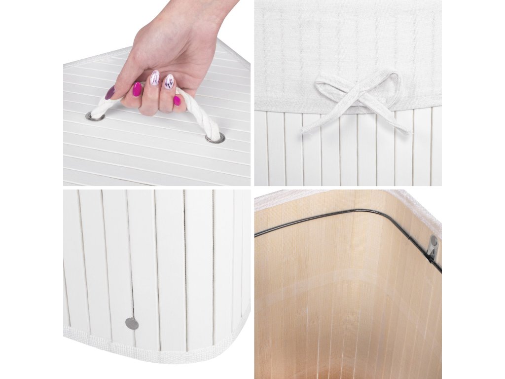 - A készlet elemei (5 db): bambusz test, MDF alj, felső merevítés fémdrótból, vászon belső, bambusz fedél