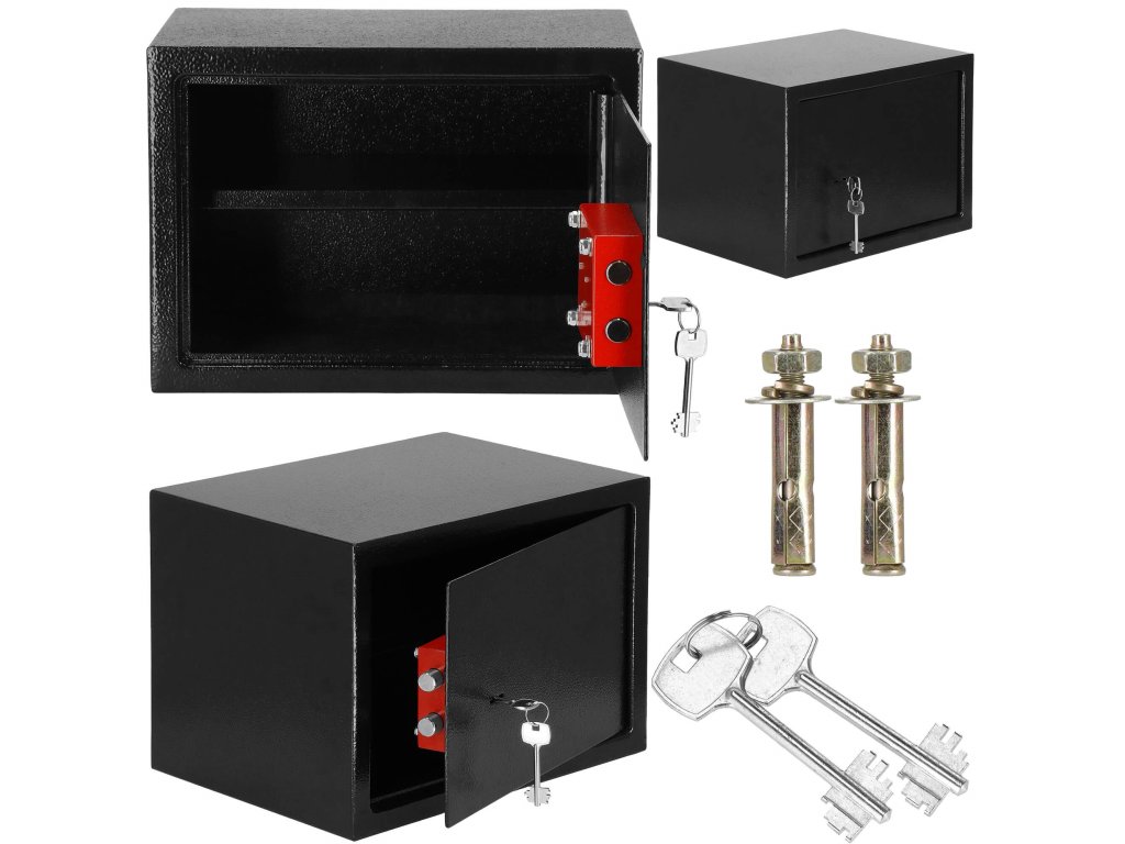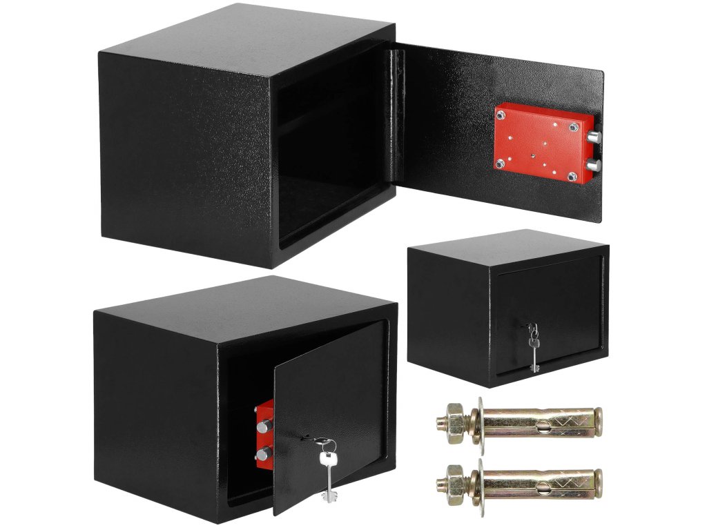 - Továbbá: falhoz és padlóhoz rögzíthető (dübel a készletben), kivehető belső polc, filc betét a széf belsejének hangtompítására