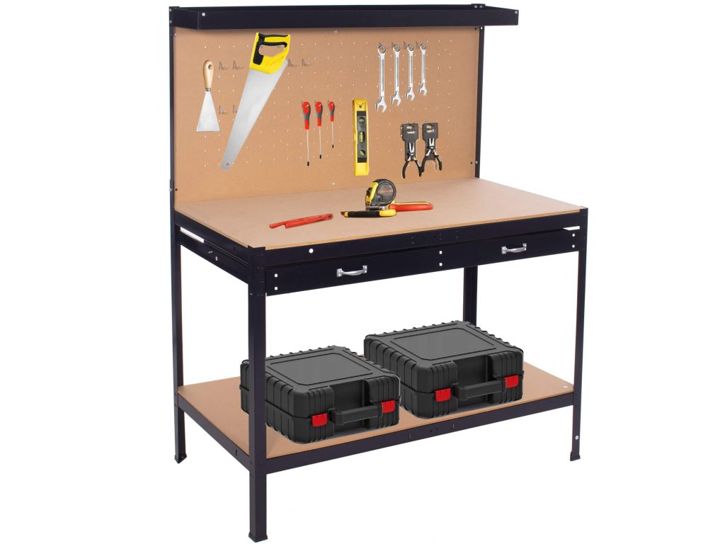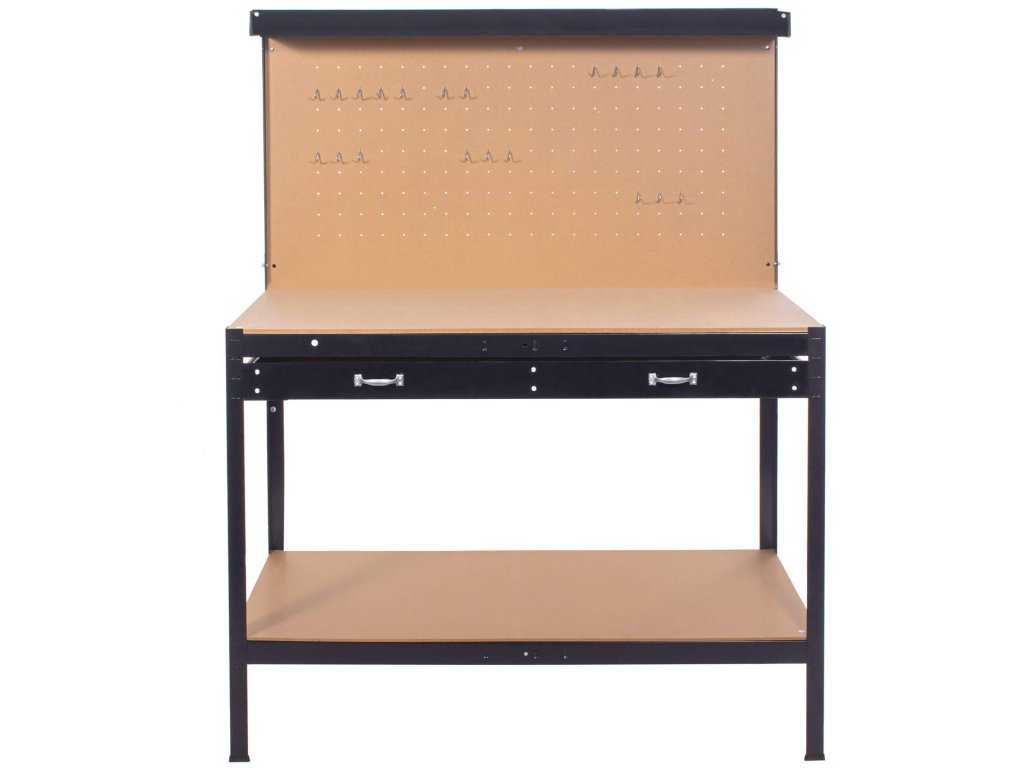 - A munkapad az alábbi elemekkel van felszerelve: munkafelület, fiók a munkafelület alatt, alsó polc, felső polc, lyukas fal