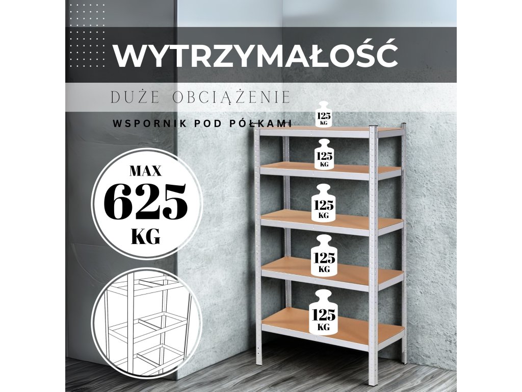 - Maximális terhelés polconként: 125 kg