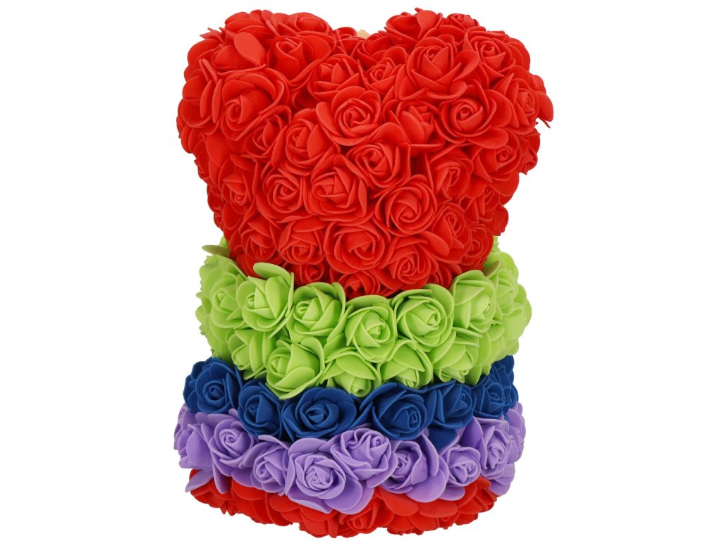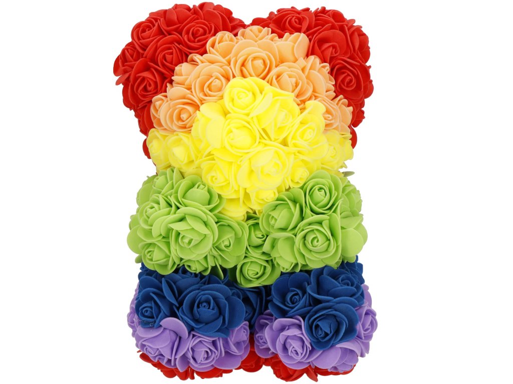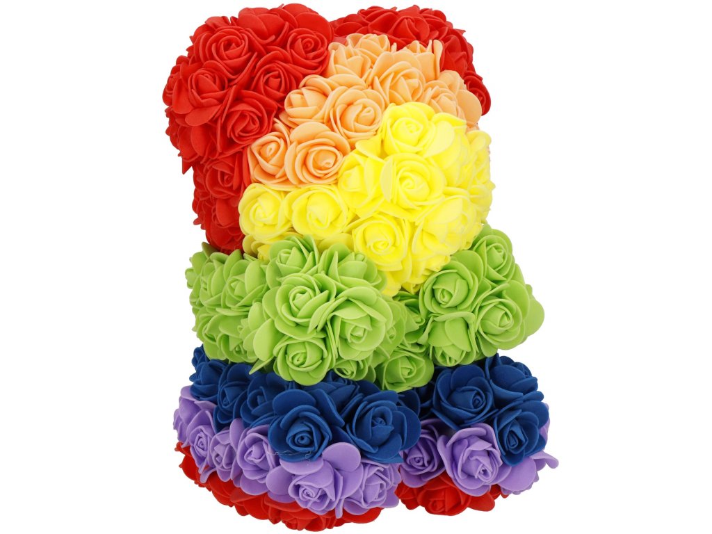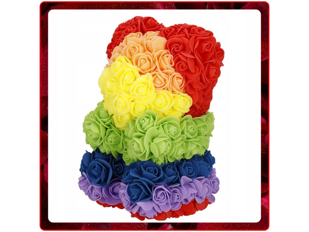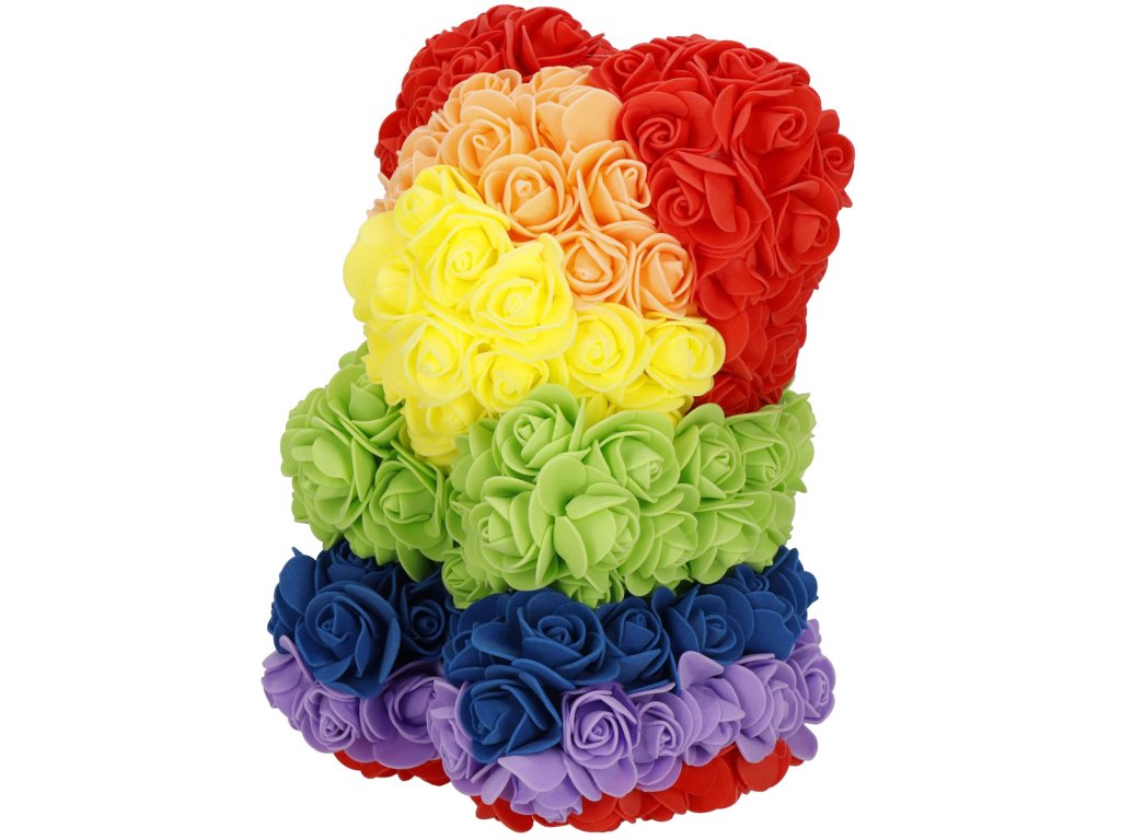 - Minta: ülő pozícióban lévő szivárványszínű rózsamackó