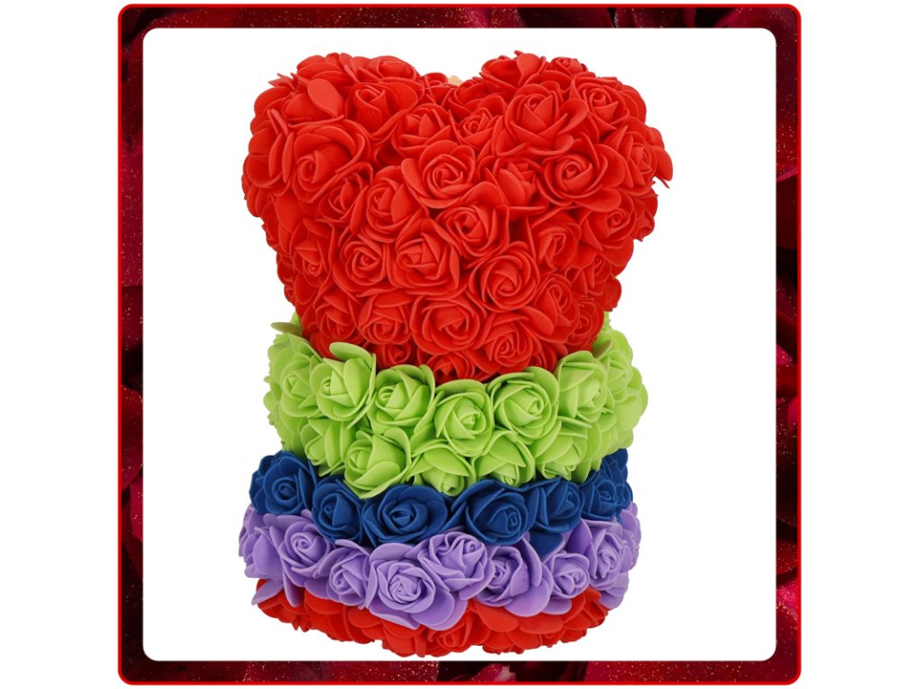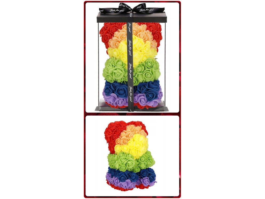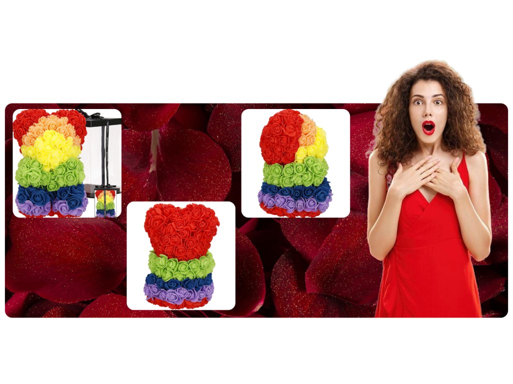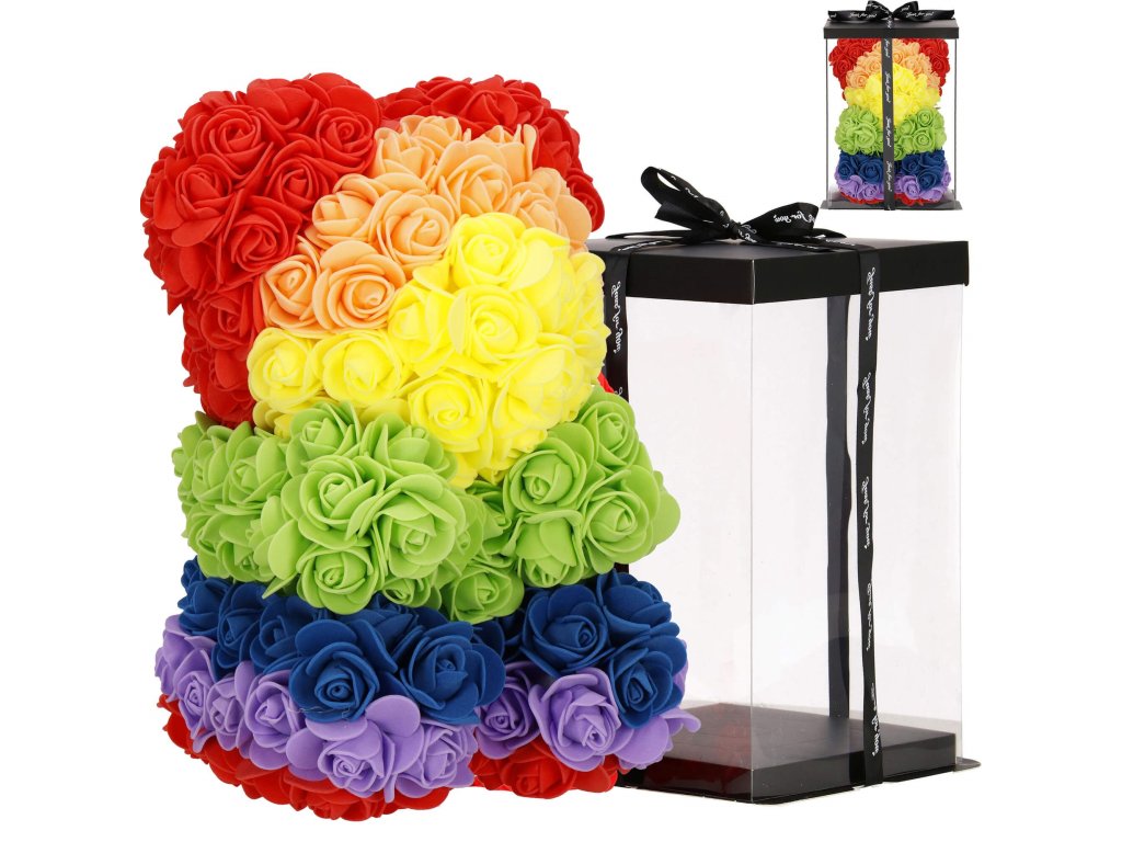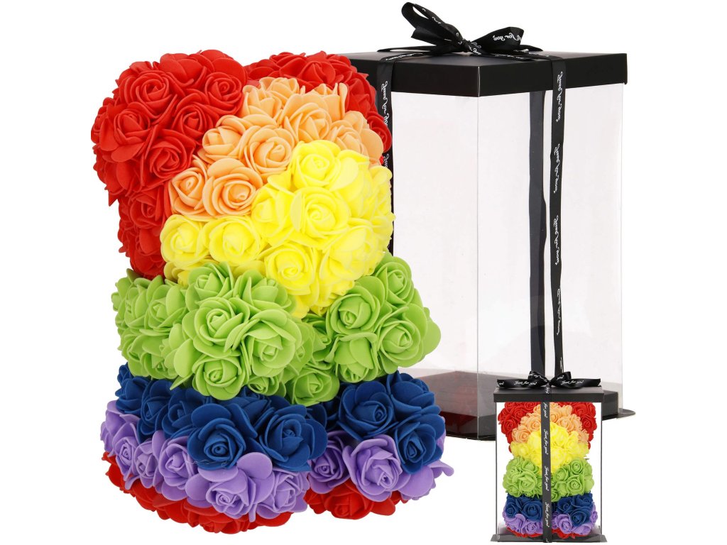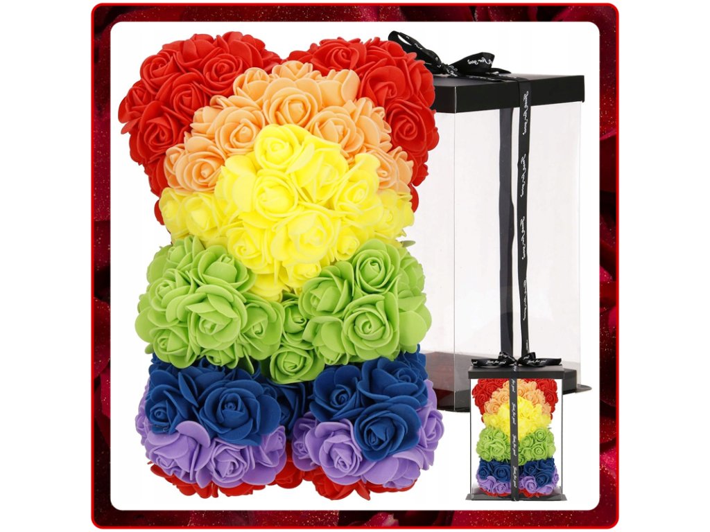 - Minta: ülő pozícióban lévő szivárványszínű rózsamackó