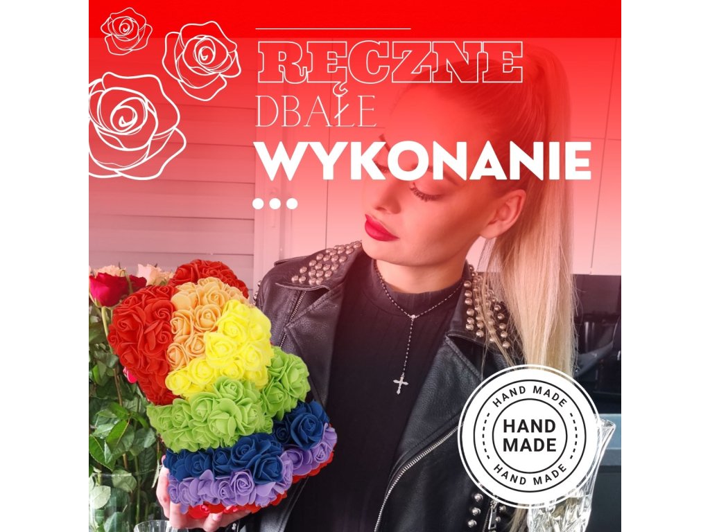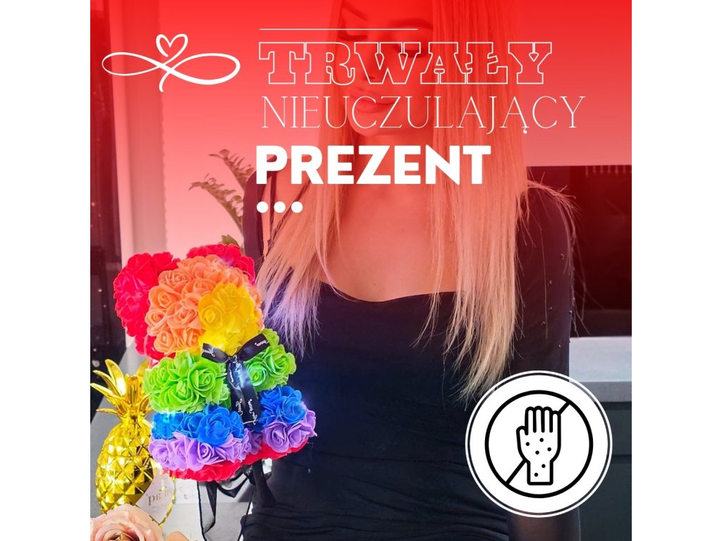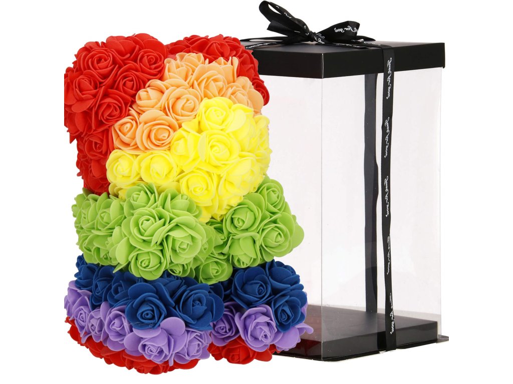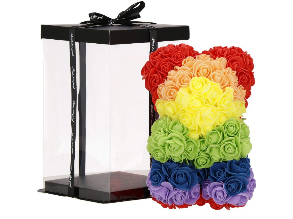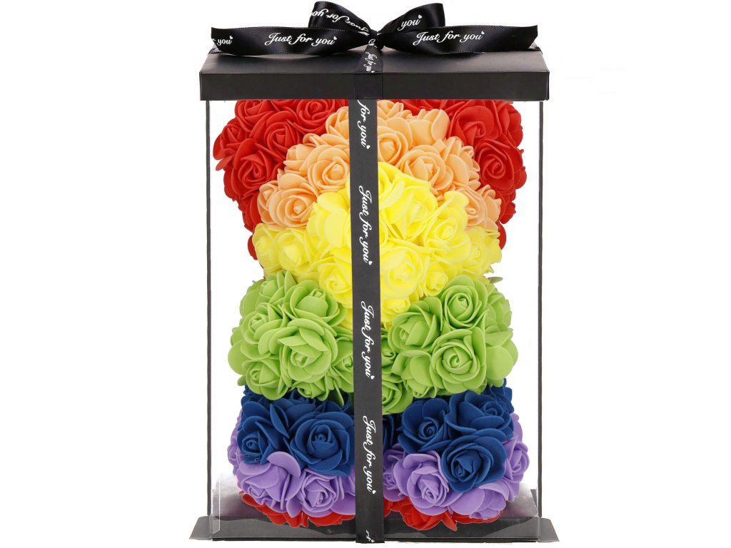 - Minta: ülő pozícióban lévő szivárványszínű rózsamackó