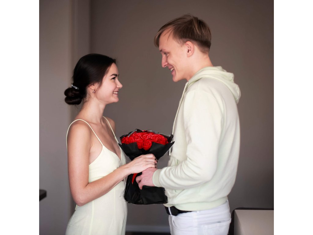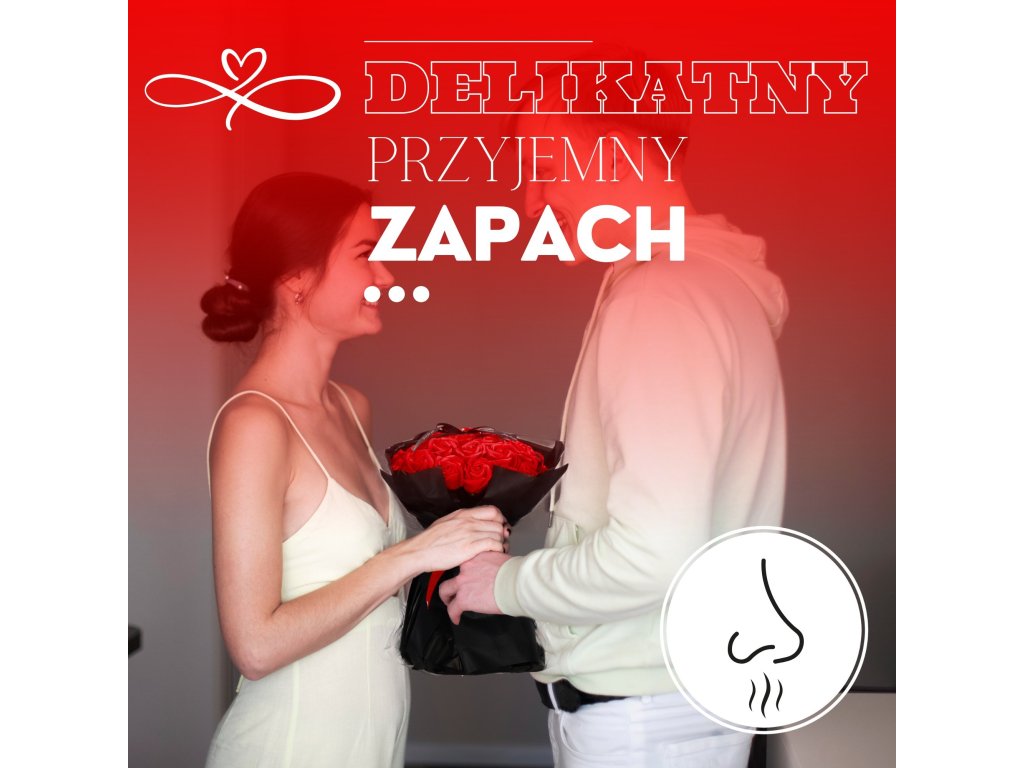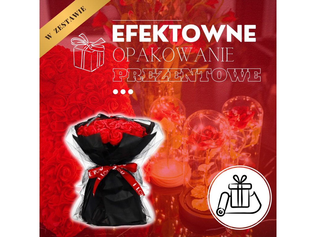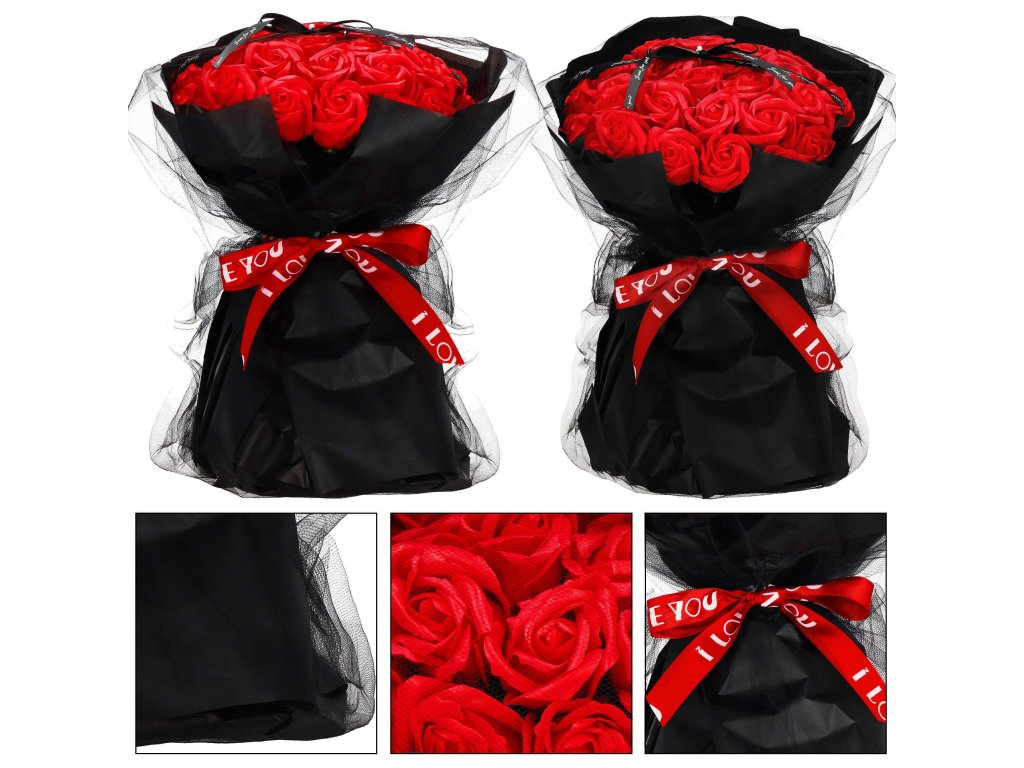 - Típus: piros szappanrózsa csokor fekete díszpapírban, tüll anyaggal bevonva