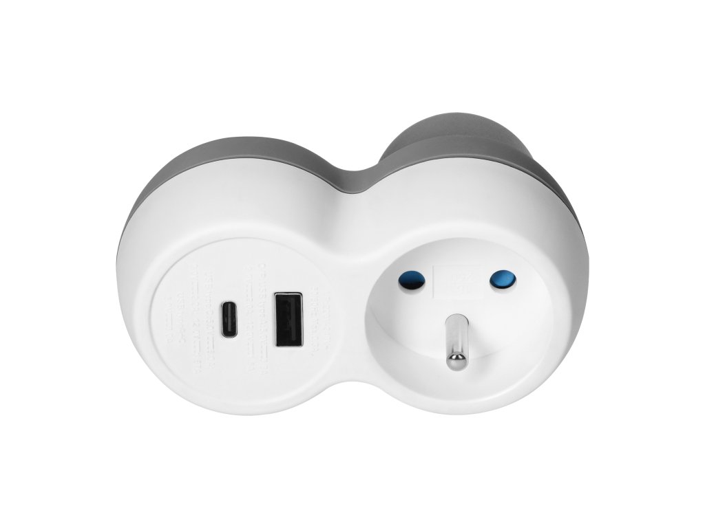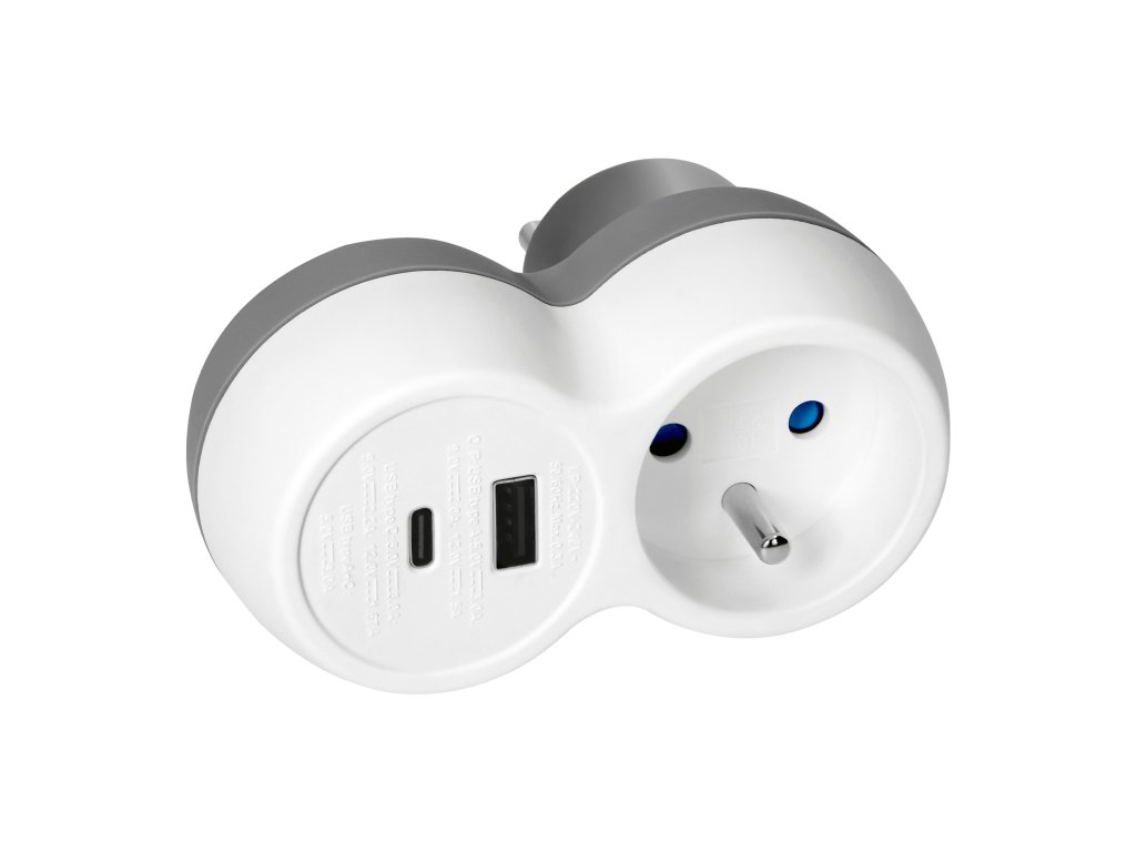 A konnektoros elosztó töltővel funkcionális megoldás két hálózati eszköz csatlakoztatására és két mobil eszköz egyidejű töltésére.Az egység egy 2P+E francia típusú védőérintkezős aljzattal és két USB porttal (A+C) van felszerelve. A névleges áram 16 A, a maximális terhelhetőség 3680 W, ami stabil és biztonságos áramellátást biztosít. A tápfeszültség 230V. Az USB töltő kimeneti áramot 2.4A, feszültséget 5V biztosít, ami 12W kimeneti teljesítménynek felel meg.