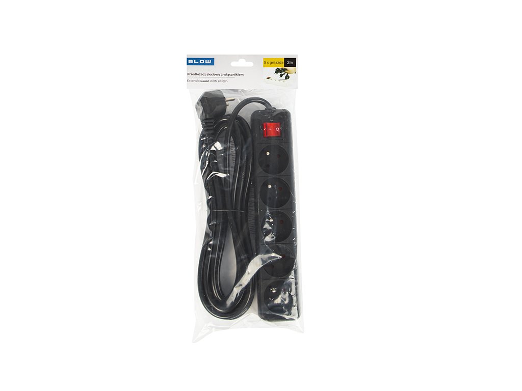 BLOW fekete színű hálózati hosszabbító, amely öt aljzattal rendelkezik, otthoni használatra készült. A hosszabbító lehetővé teszi az elektromos aljzattól távol eső készülékek csatlakoztatását. A termék egyik oldalán 5 aljzat található, amelyeket szögben elfordítottak, és egy kapcsoló, a másik oldalon pedig egy egyetlen szögletes hálózati csatlakozó.