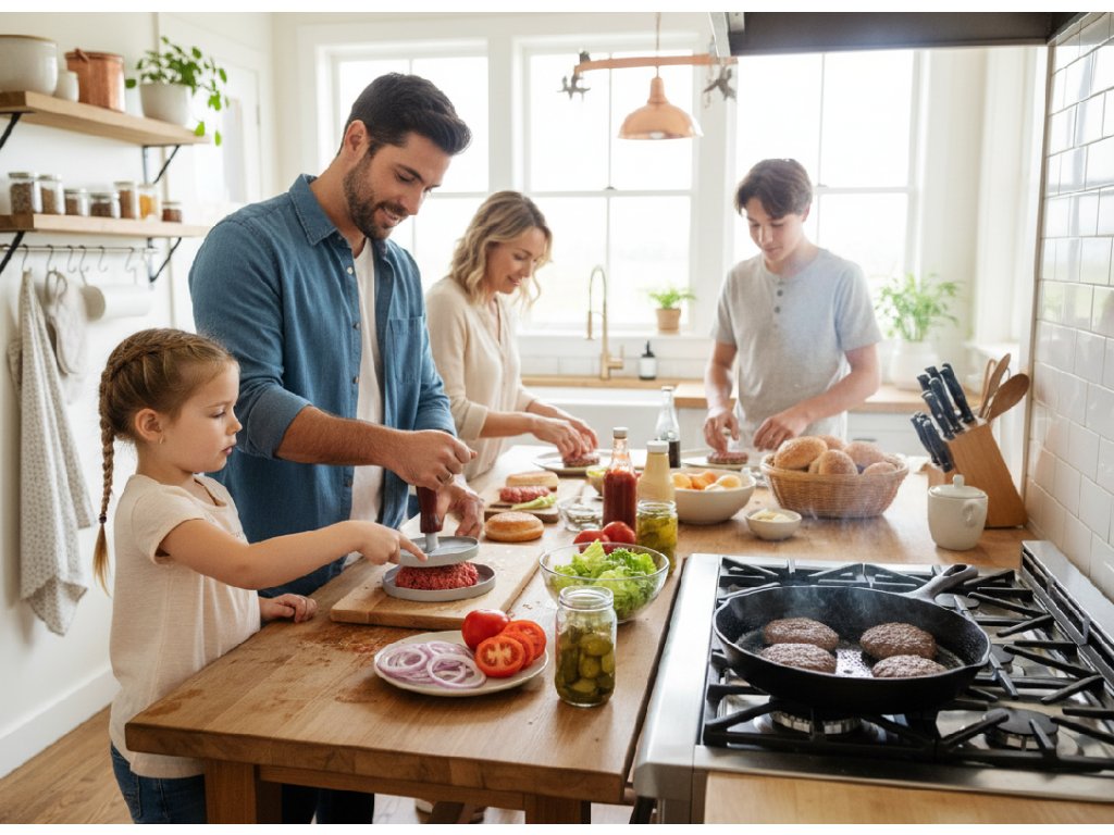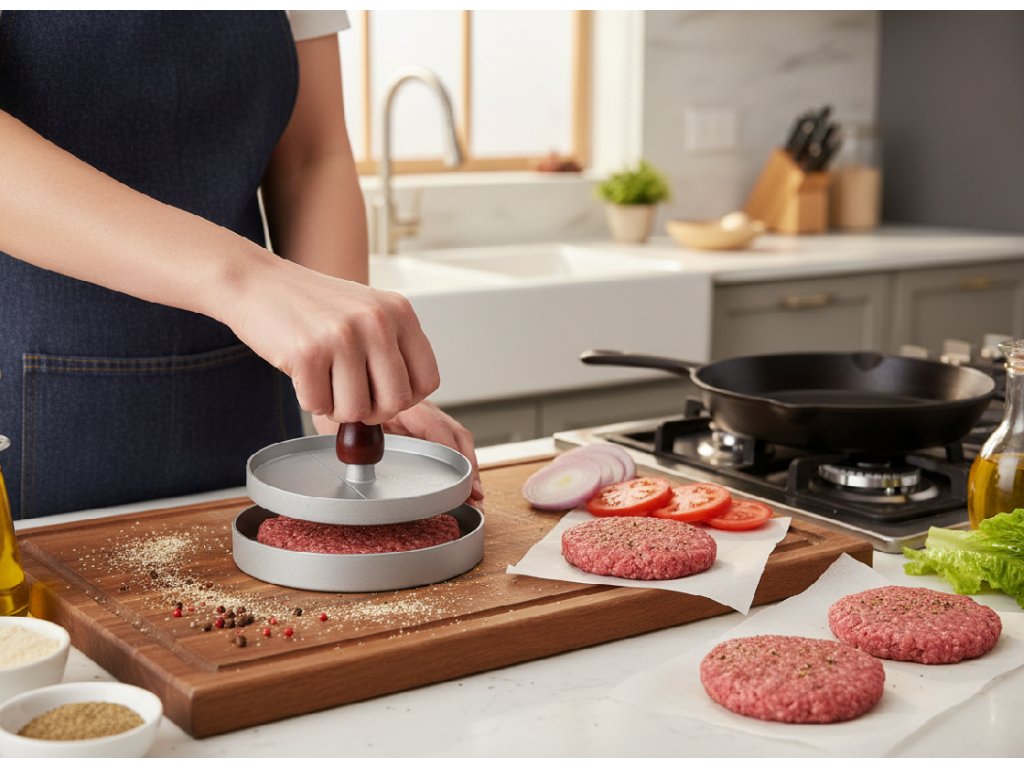A hamburgervágó egy kiváló eszköz, amely megkönnyíti a megfelelően formázott húspogácsák elkészítését. Tartós anyagokból készült, biztosítva a tartósságot és kényelmet a használat során. Ideális napi használatra a konyhában, lehetővé teszi a hamburgerek könnyű formázását a megfelelő vastagsággal.