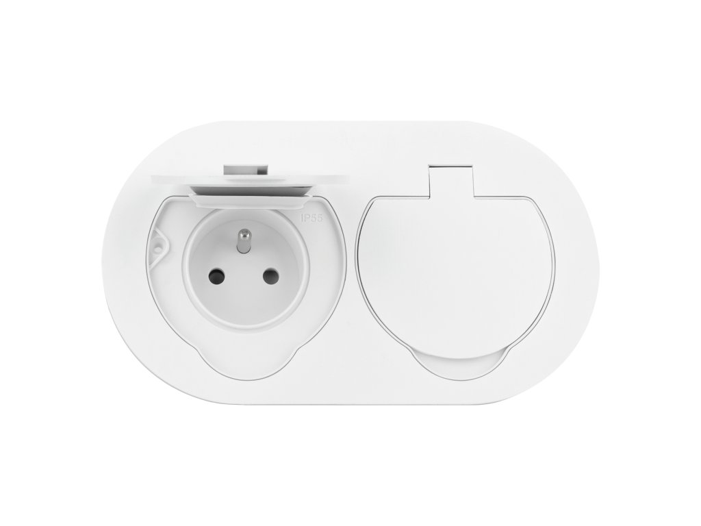 A magas IP55 biztosítja, hogy a termék ellenálló a porral és a vízsugarakkal szemben, és évekig használható. Az aljzat tartós cink ötvözetből és kiváló minőségű műanyagból készül, hogy megbízható működést garantáljon. A fehér felület esztétikus megjelenést kölcsönöz. A beépített védőburkolat további védelmet nyújt az aljzatoknak a porral és nedvességgel szemben. A burkolat 110°-os szögben nyílik, lehetővé téve a kényelmes hozzáférést az aljzatokhoz.