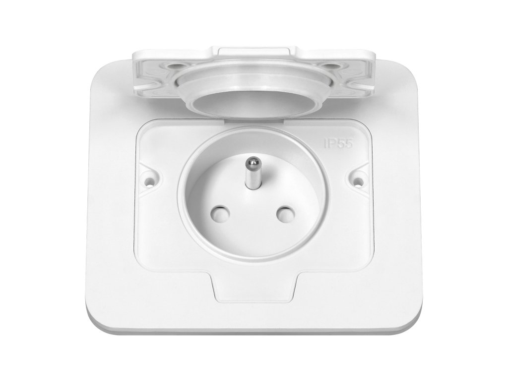 A magas IP55 biztosítja, hogy a termék por- és vízsugarakkal szemben ellenálló, így évekig használható. Az aljzat tartós cinklemezből és kiváló minőségű műanyagból készült, hogy megbízható működést garantáljon. A fehér felület esztétikus és minimalista. A beépített védőfedél további védelmet nyújt a por és a nedvesség ellen. A fedél 110°-os szögben nyílik, lehetővé téve a kényelmes hozzáférést az aljzatokhoz.
