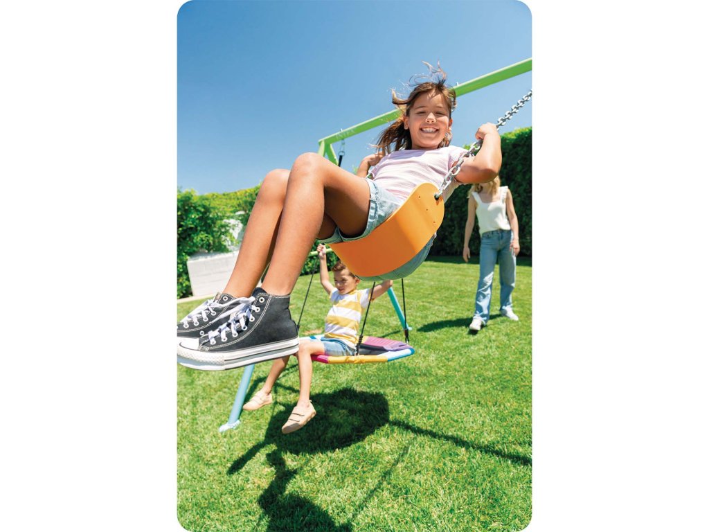 Színes hinta 2 az 1-ben GÓLYAFÉSZEK 235 cm x 254 cm x 200 cm Az új hinták 6 cm átmérőjű horganyzott acélcsövek kapacitását használják ki a nagyobb teherbírás és szerkezeti stabilitás érdekében. A gyerekek el lesznek ragadtatva ettől a hintától. Az Intex úgy tervezte, hogy hangsúlyt fektetett a minőségre és a biztonságra. A speciális rögzítő kampók, amelyek a hintát a talajhoz rögzítik, garantálják a stabilitást és a biztonságot. Játék 3-10 éves gyerekek számára. A "Gólyafészek" 50 kg alatti gyerekek számára használható. A "Gólyafészek" hintán a maximális gyereklétszám 2 fő. Az egyik, rugalmasságot biztosító láncos ülésen 1 fő helyezkedhet el, maximális súly 50 kg. Tartós és biztonságos anyagok gyerekek számára. Ezenkívül az egyszerű és funkcionális belső csomagolási szerkezetnek, valamint az átlátható szerelési útmutatónak köszönhetően a hinta összeszerelése egyszerű és gyors lesz. Állítható magasságú kötelek. A színes "Gólyafészek" a legmagasabb minőségű anyagból készült, amely hosszú élettartamot és tartósságot biztosít. Biztonságos rögzítőrendszer a talajhoz. Állítható magasságú kötelek. Rugalmas ülés láncos hintamechanizmussal, plastizollal bevonva. MAGAS KEMÉNYSÉGŰ HORGANYZOTT ACÉLCSÖVEK A földfelszíni medencék csőszerkezeteinek tapasztalataiból fakadóan ez a termék rozsdamentes és rendkívül stabil szerkezeti anyagokat tartalmaz a nagyobb szilárdság érdekében. A horganyzott acélkeret porfestett, teljesen lézerhegesztett – az anyag tartósságának érdekében készült. A hinta méretei: 235 cm x 254 cm x 200 cm A "Gólyafészek" méretei: átmérő 81 cm A "Gólyafészek" 50 kg alatti gyerekek számára használható. A hintán a maximális gyereklétszám 2 fő. Az egyik, rugalmasságot biztosító láncos ülésen 1 fő helyezkedhet el, gyerekek 50 kg alatt. Kor: 3-10 év A készlet tartalma: egy hinta egy "Gólyafészek"Kiegészítő paraméterek