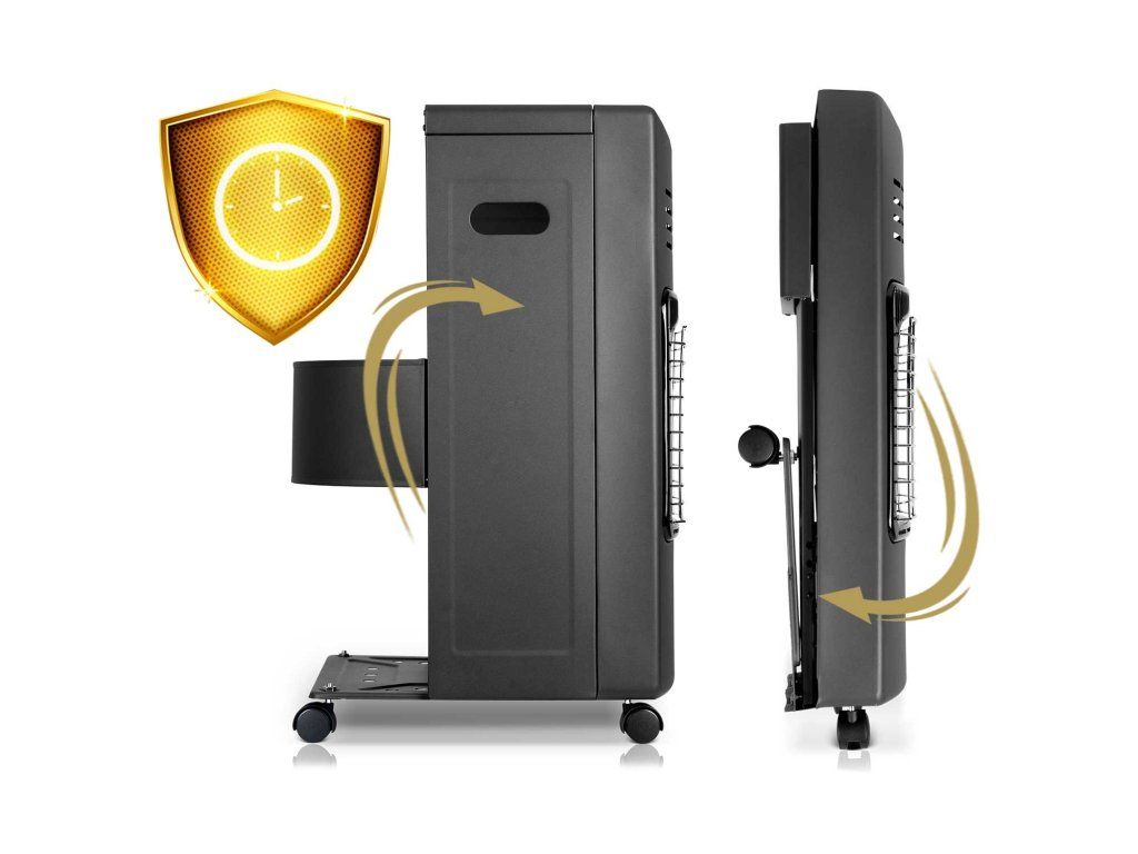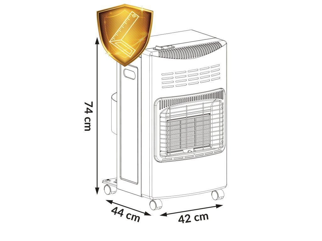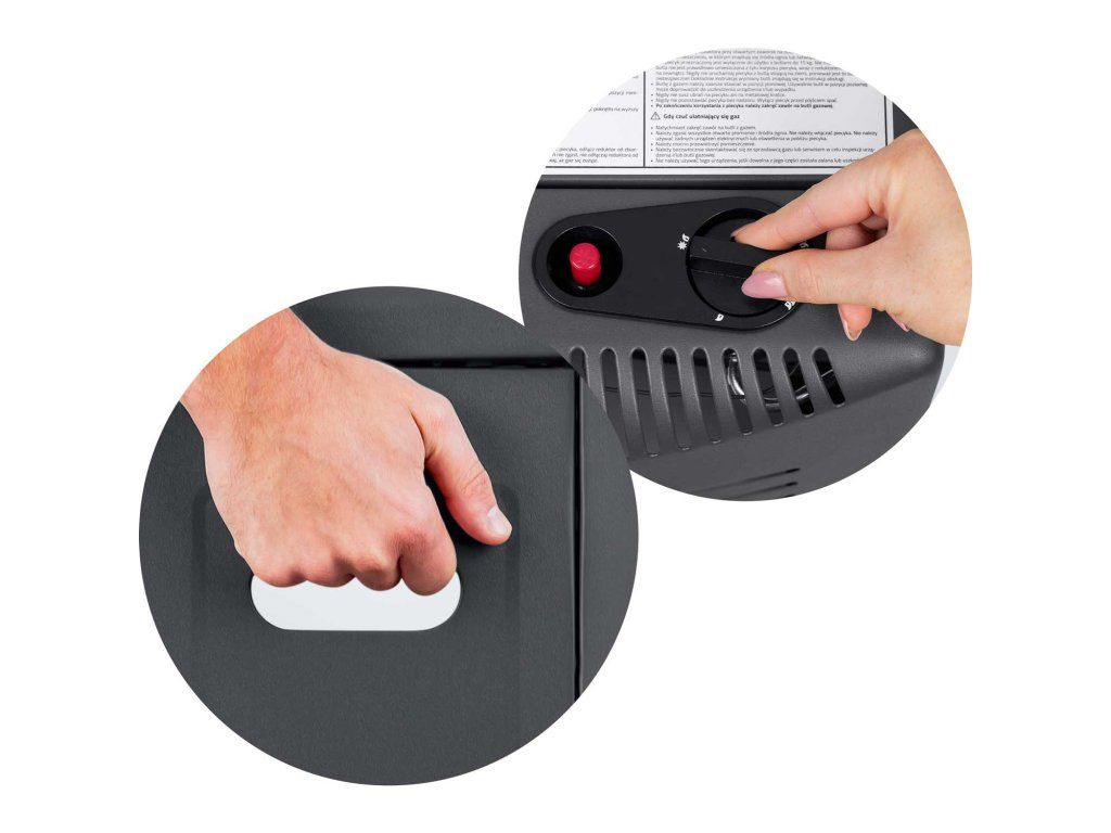 Amasszív kialakításnak köszönhetően a gázkályha nem esik össze fűtés közben , agörgők pedig lehetővé teszik a fűtőberendezés gyors és egyszerű mozgatását.