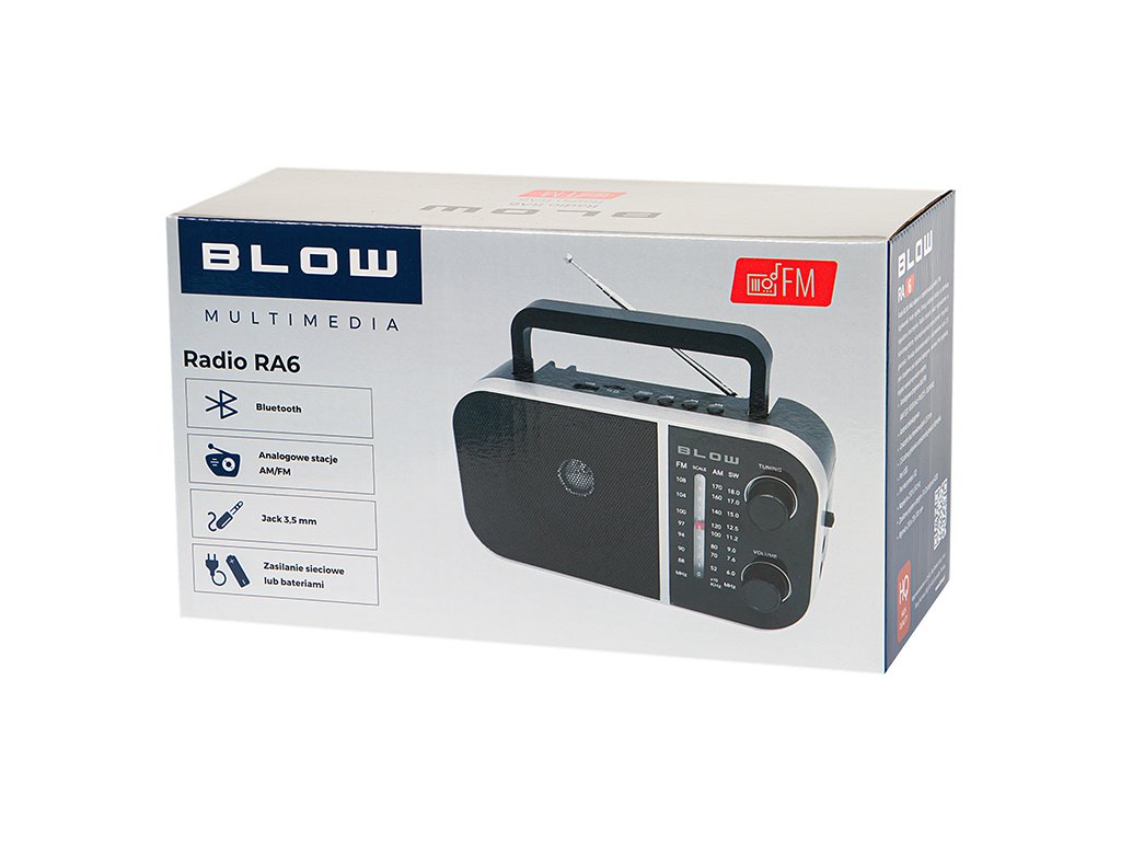 A BLOW RA6 hordozható rádió AM és FM frekvenciákat fogad. A felhasználó a hangolótárcsa segítségével kiválaszthatja kedvenc állomását .Kis mérete ellenére a rádió kiváló hangzással rendelkezik, amelyről a kiváló minőségű 3,5 hüvelykes hangszóró gondoskod ik.Az egész termék gondosan kiválasztott anyagokból készült, hogy minden felhasználó elégedett legyen.
