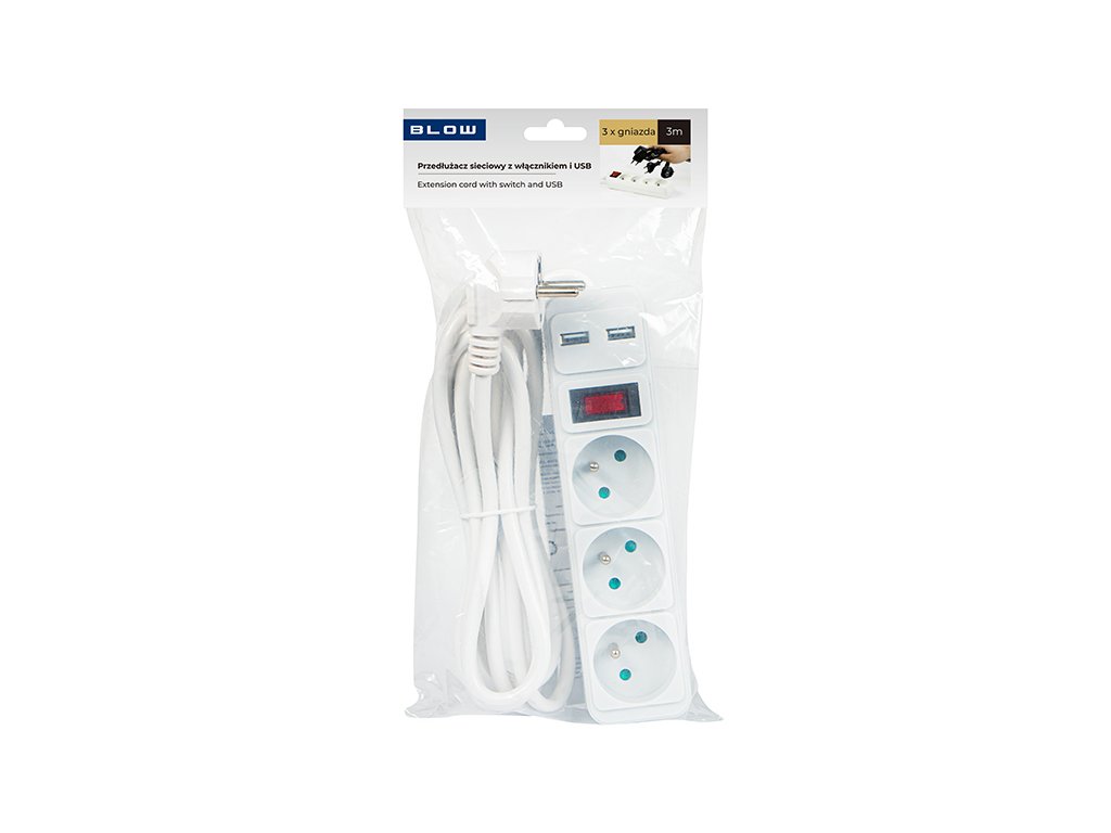 Hosszabbító kábel USB-vel, 3 aljzat, 3m, fehér