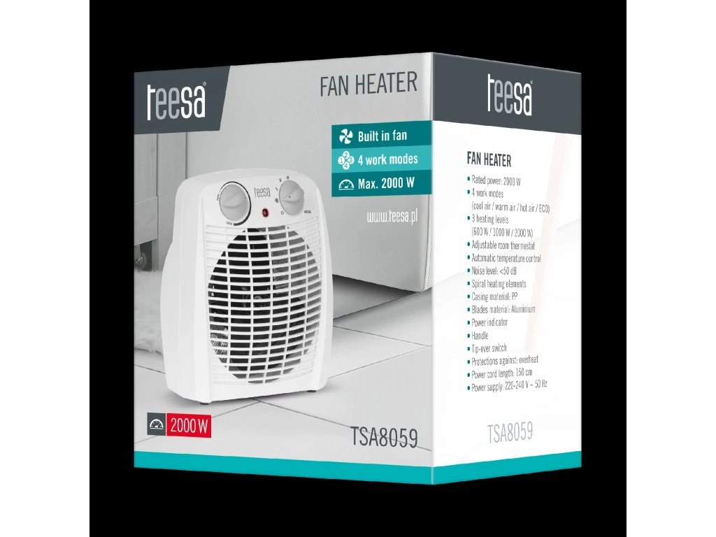 A Hősugárzó TSA8059 egy pótolhatatlan készülék, amely sokoldalúságának köszönhetően hideg napokon kellemes meleget biztosít, melegebb hónapokban pedig hideg levegő befúvás funkciót kínál. Ideális otthoni és irodai használatra, bárhol és bármikor biztosítja a hőkomfortot.