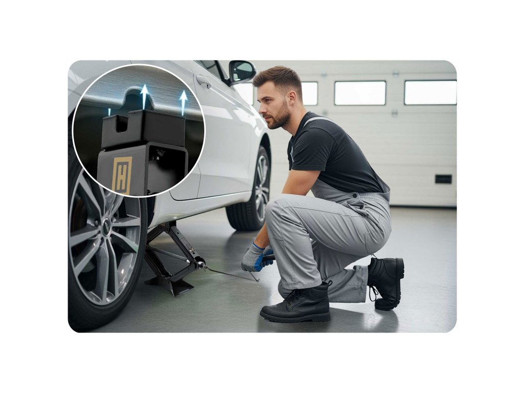 Hiba esetén idő és rendezettség számít. Ezért emelőnk tökéletesen elfér a pótkerékben – mindig kéznél van, készen áll a használatra.
