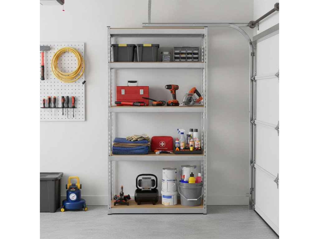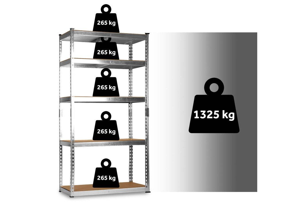 A polc 5 db polcból áll, amelyeken termékeket, kartonokat vagy készülékeket helyezhetsz el, maximálisan terhelve minden polcot 265 kg-ig.