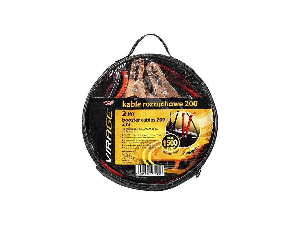Személygépkocsikhoz tervezett indítókábelek. 1500 cm3-ig terjedő motorok indításához. 2 m hosszú .