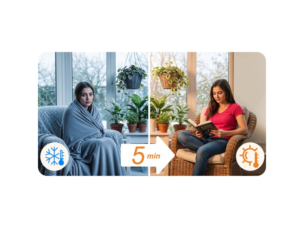 Gyors felmelegedés – a meleg már 5 perc után érezhető! Ideális a helyiség hőmérsékletének gyors változtatásához.