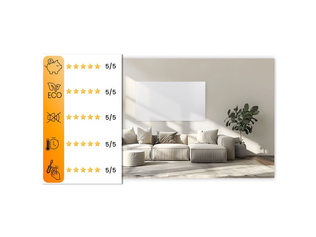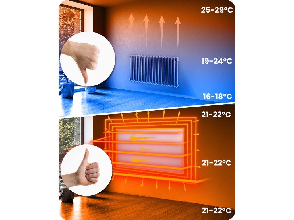 Gyors felmelegedés – a panel azonnal működésbe lép, időt és energiát takarítva meg, ellentétben a hagyományos fűtőtestekkel, amelyek hosszú ideig melegítik a levegőt.